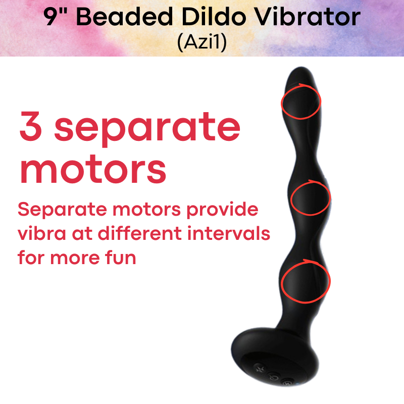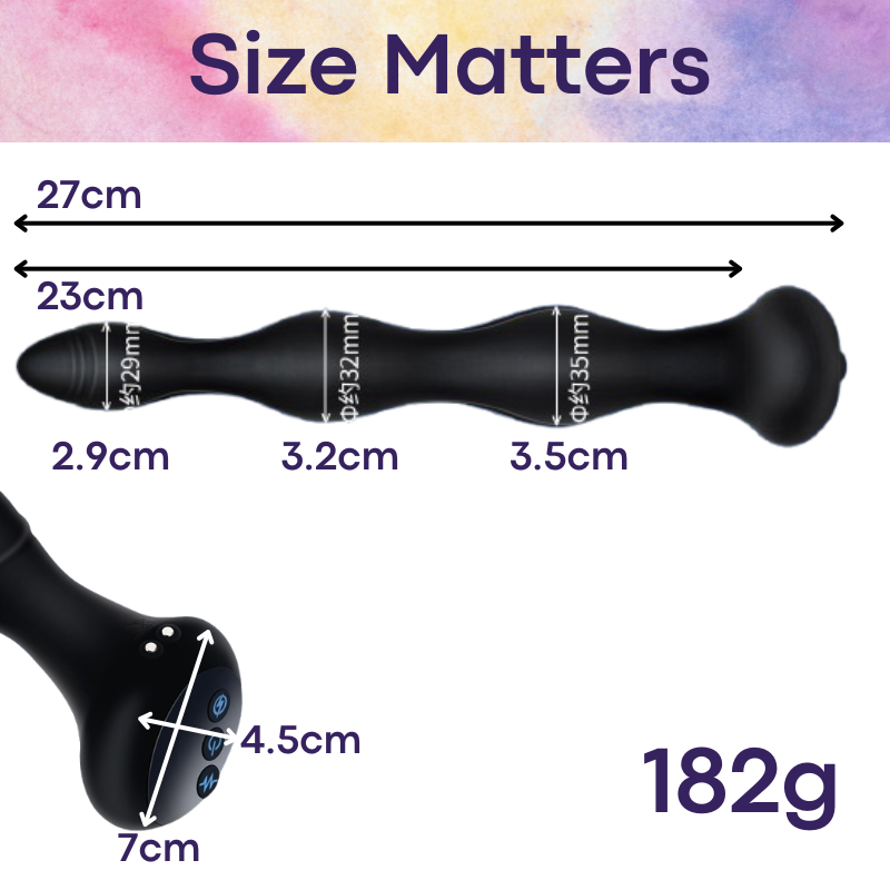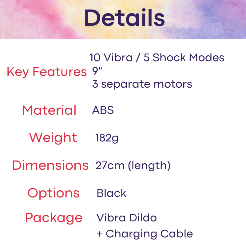 Made of ABS. 9" long dildo vibrator/massager. Comprise of 3 separate motors that provides 10 exciting modes. Middle part gives out 5 electric pulse modes.