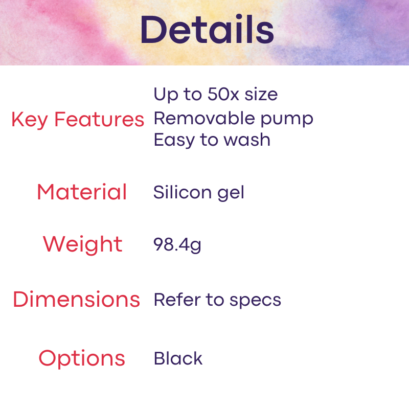 Made of silicon gel. Removable pump. Pump up to 50x in size. Tighten screw and pump to desired/comfortable size. Loosen screw to release air.