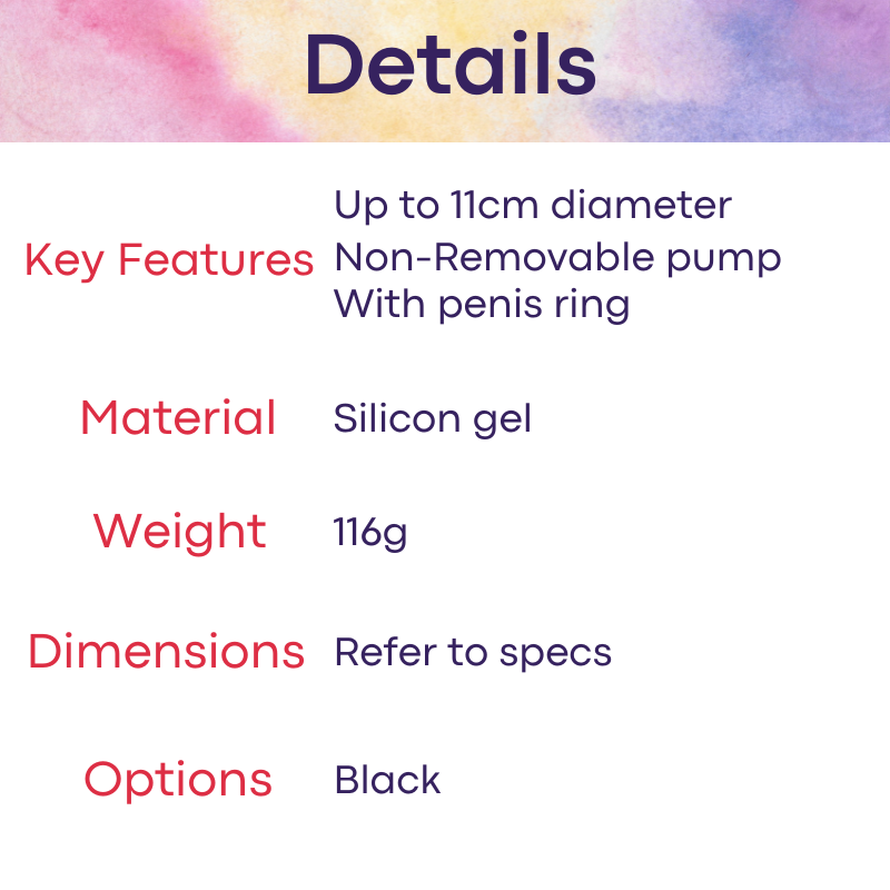 Made of silicon gel. Non-Removable pump. Tighten screw and pump to desired/comfortable size. Loosen screw to release air. Comes with penis ring.