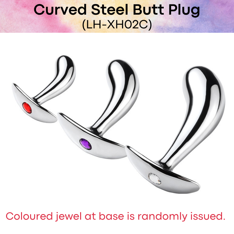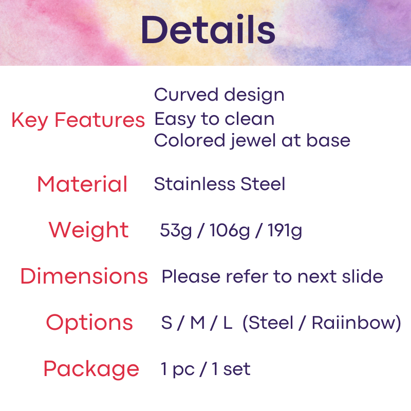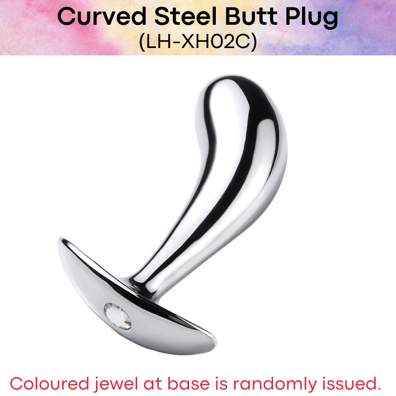 Made of stainless steel. Decorative coloured jewel at base handle (random colours will be issued). Curved body leading to a large curve point to hit the right spot.
