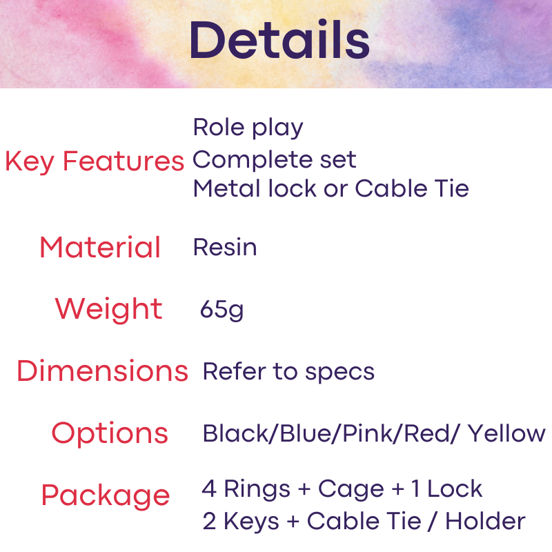 Set come with 4 rings (42mm/45mm/48mm/52mm), 1 cage, 1 metal lock/2 keys, cable tie and holder. Available in Black, Blue, Pink, Red or Yellow.