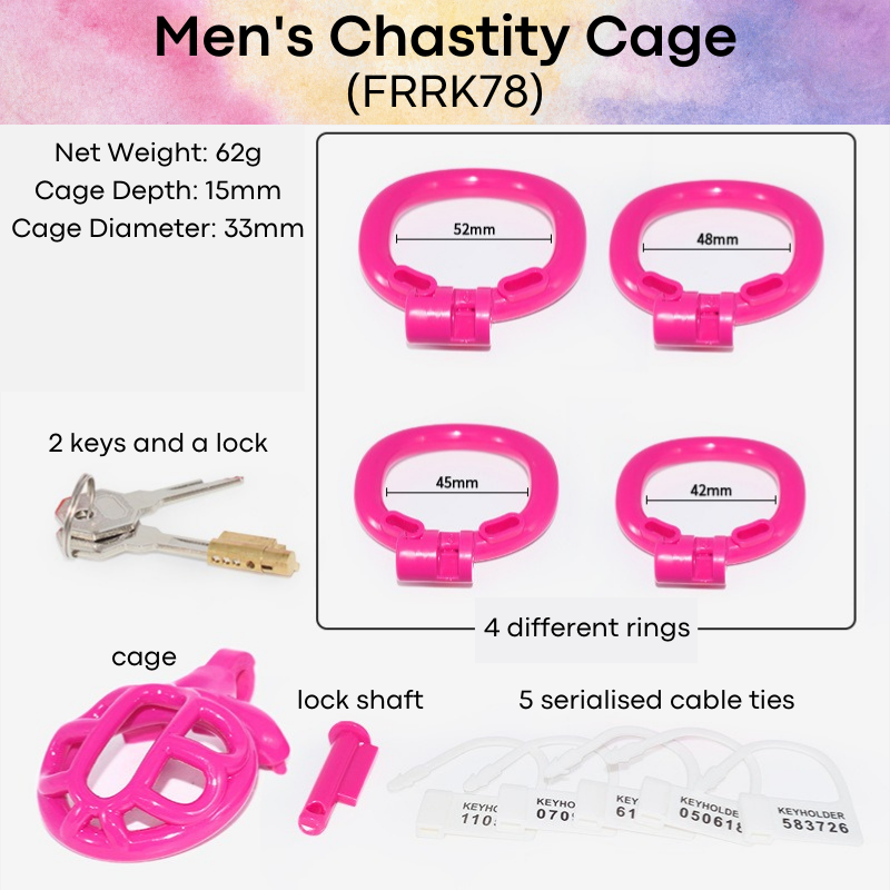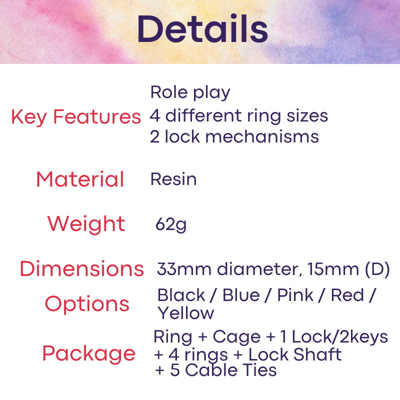 Made of resin. Durable, with quality finishing and materials. Comes with free 4 different ring sizes to suit you. 2 different lock mechanic, whether using lock-key method or lock shaft-cable tie. Cage diameter 3.5cm, with depth (length) 1.5cm. If you are a grower type, this is perfect for you!