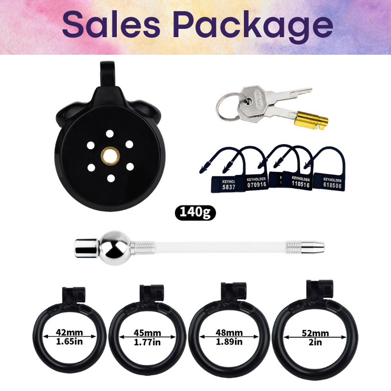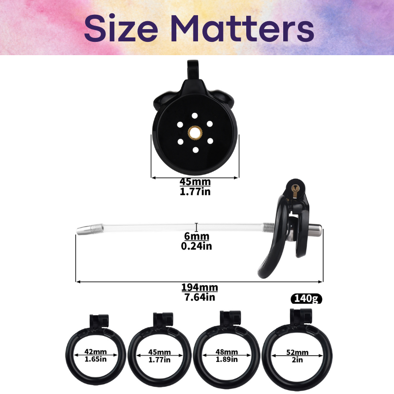 Made of resin. Durable, with quality finishing and materials. Package comes with 4 rings. Key lock or cable tie, your choice. Use with/without urethral catheter.