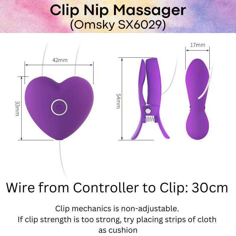 Made of ABS. With a 30cm wire from controller to clip, it allows your to experiment on different parts of your body. Clip is non-adjustable and if pressure is too strong, try placing small strips of cloth to cushion impact. 10 different vibra, multiple sensations. Simply long press to turn on controller, and with the same button, switch between the different modes.