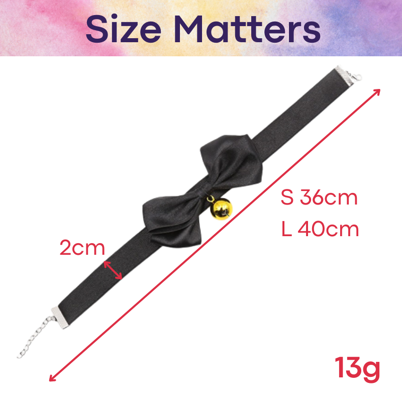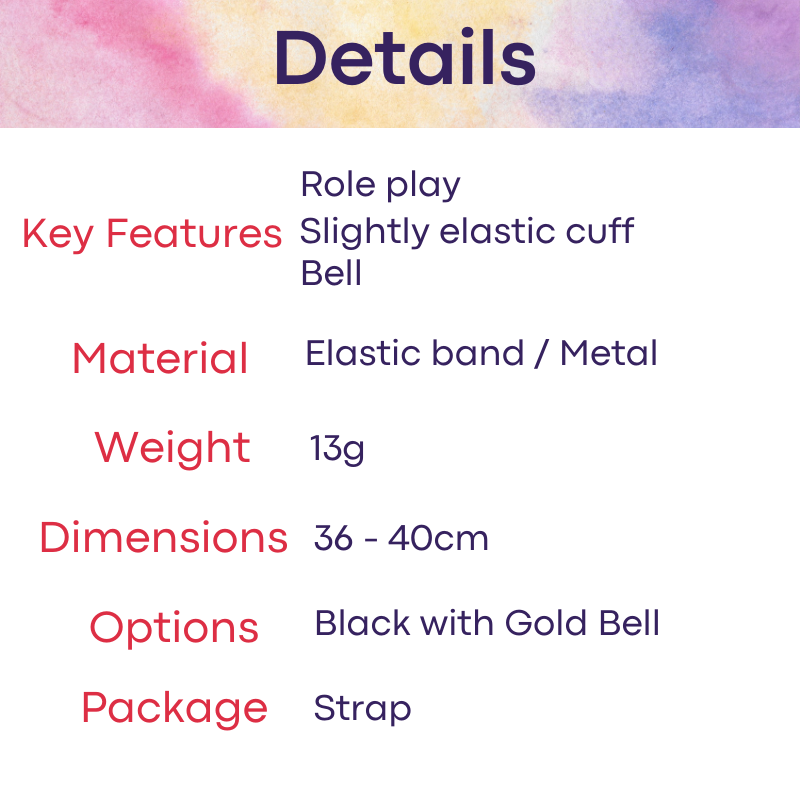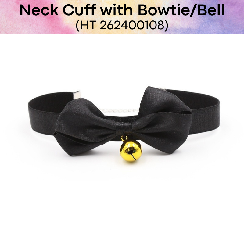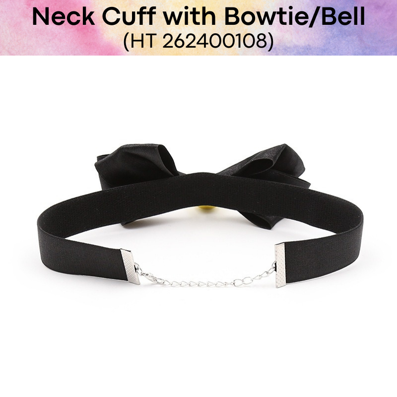 Made of elastic band (strap) and metal (bell). Simple latch mechanic for the chain, and when worn, each head body movement will ring the bell. Great for roleplay.