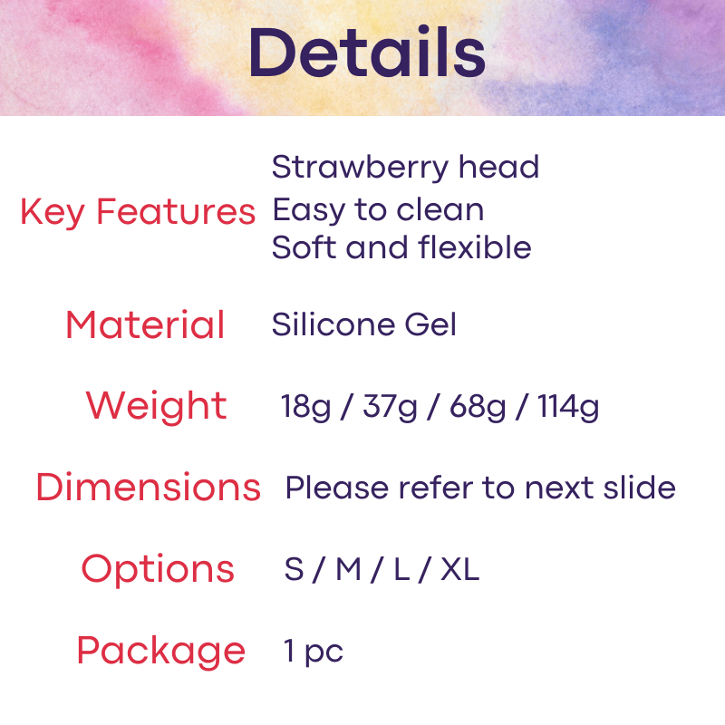 Made of silical gel. Strawberry head with short neck body. Soft and flexible.