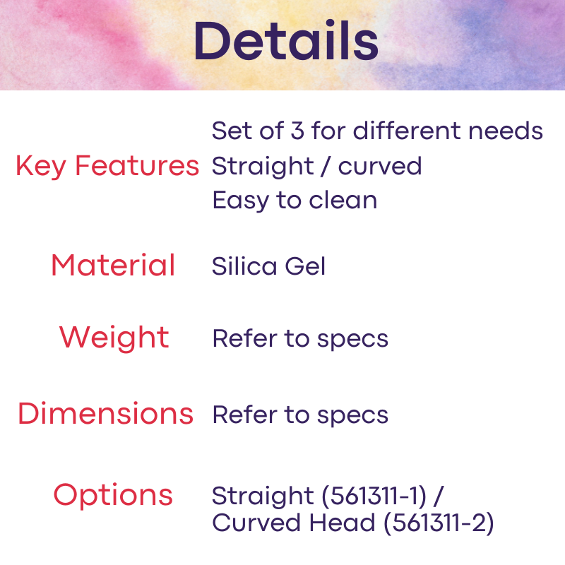 Made of silica gel. Comes in pack of 3, with choice of straight or curved head. Share with friends, or get this as a starter kit, and slowly adjust to the different sizes.