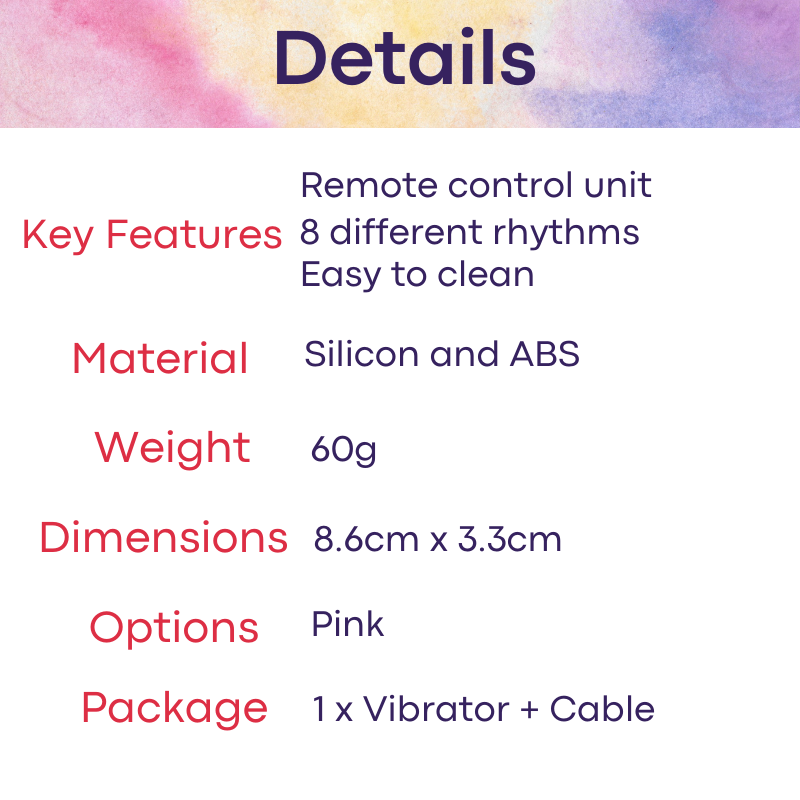 Made of ABS. 8 different vibration modes. With a remote control unit to provide hands free action. Easy to clean and maintain.