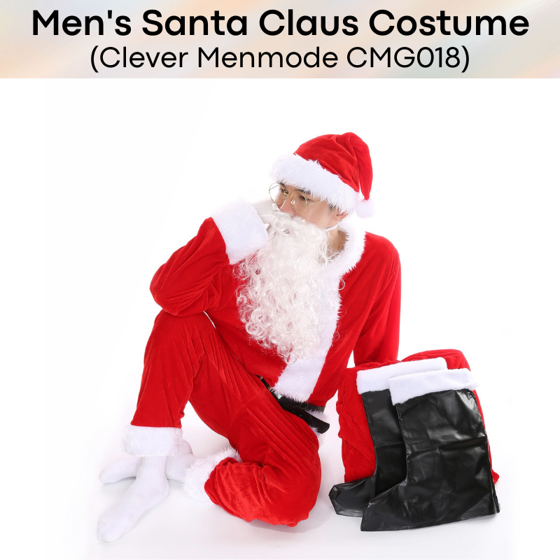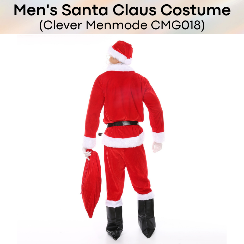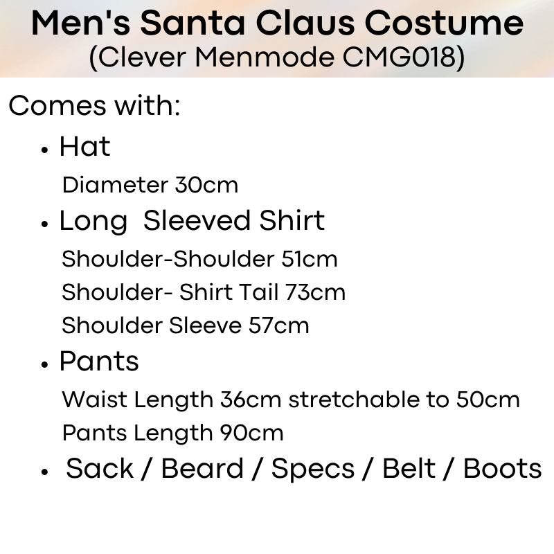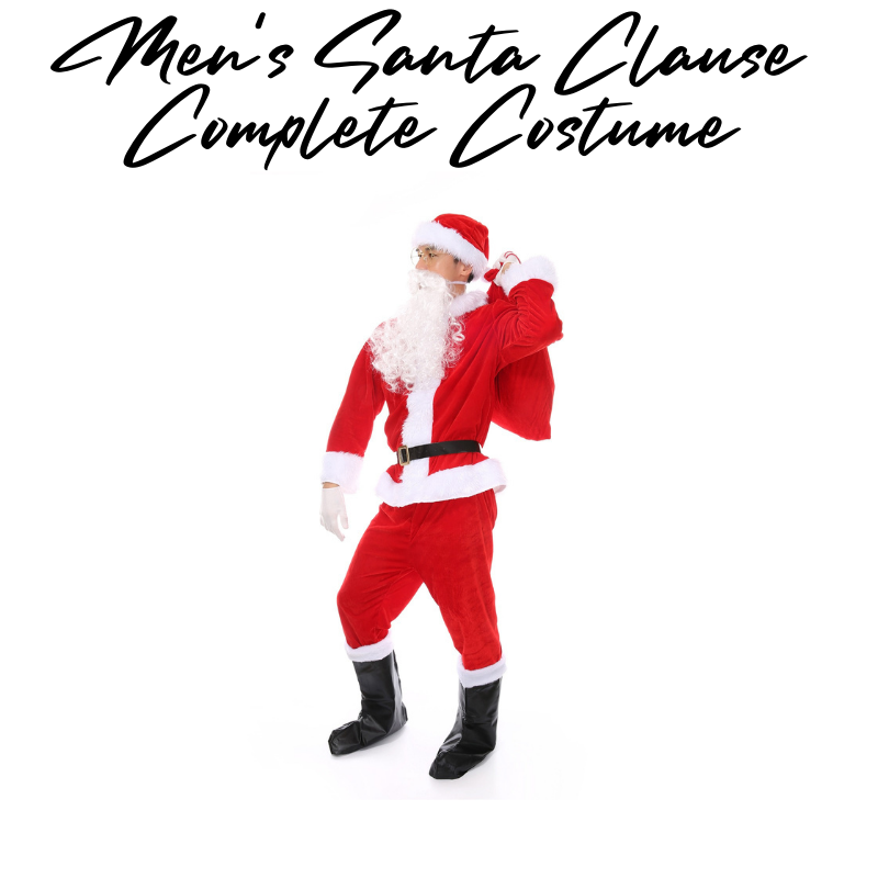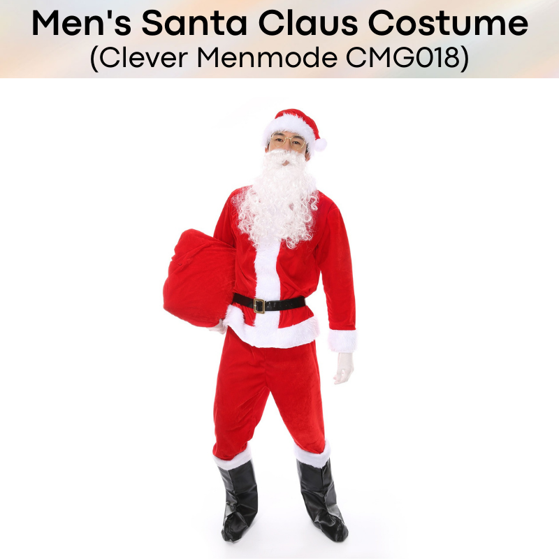 Made of polyester. Complete Santa Claus costume with shirt/pants, belt/hat, specs/beard, sack and boots. Affordable and fun.