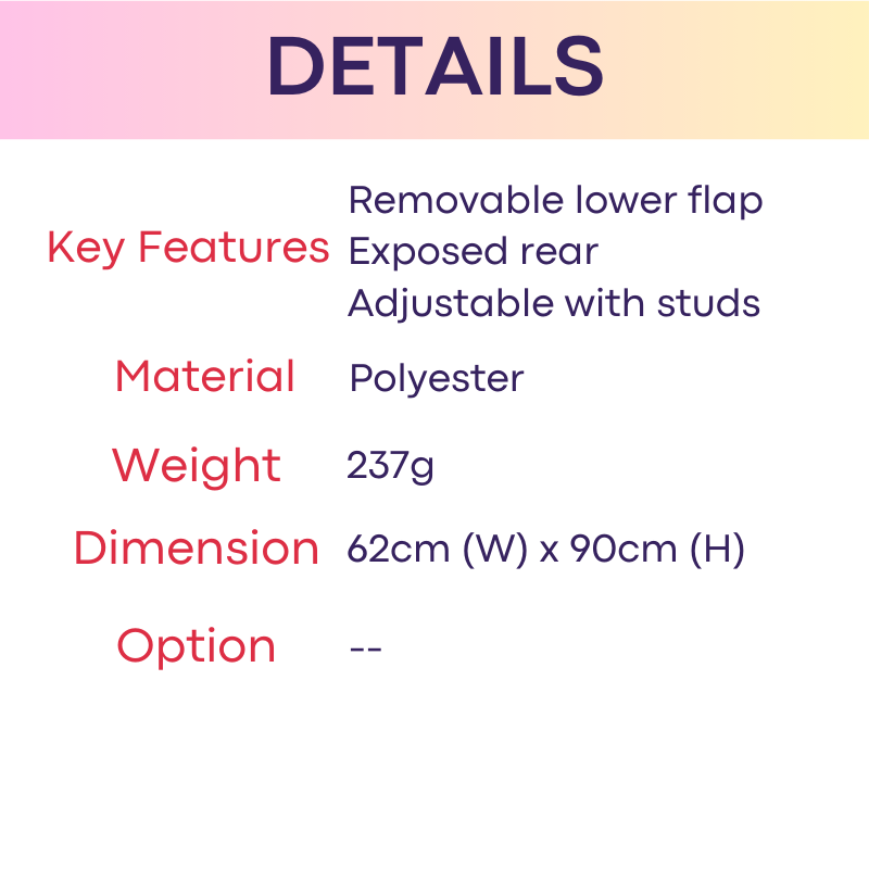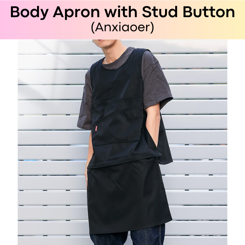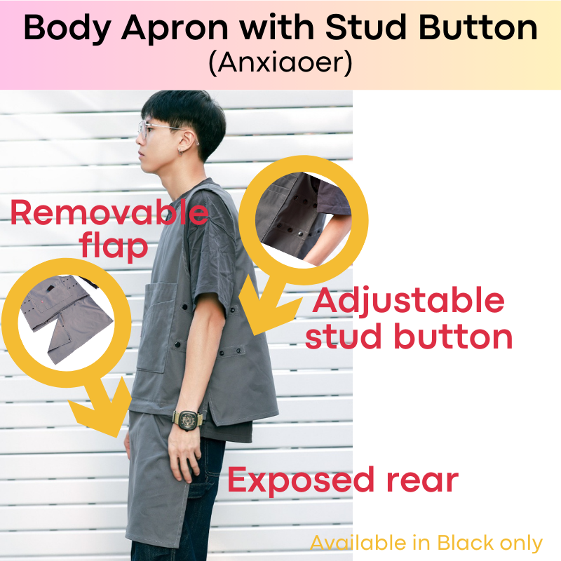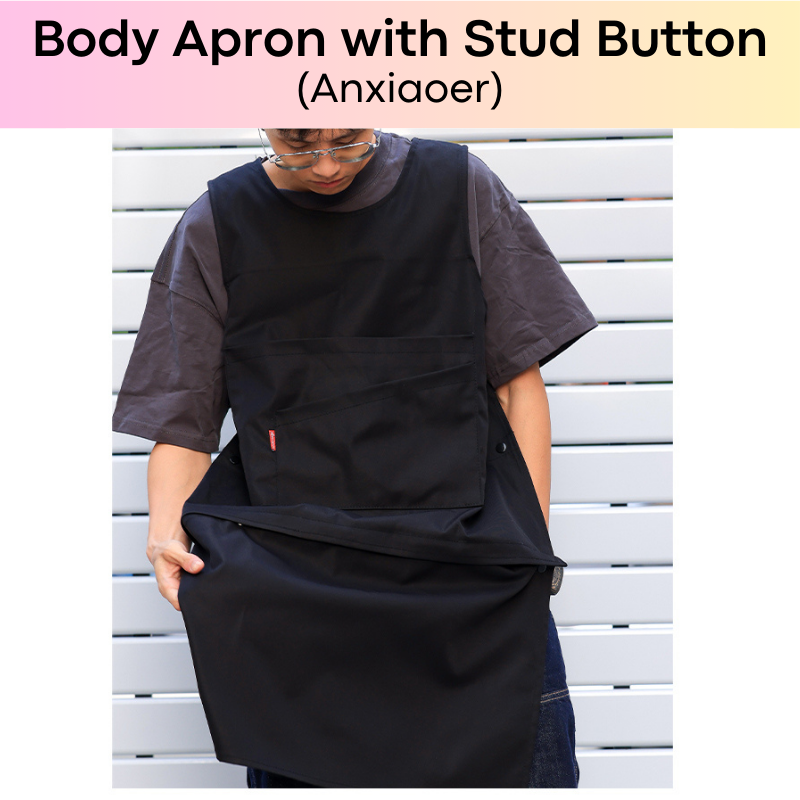 Made of polyester. Quality body apron, suitable for work or kitchen. Removable front flap. Exposed rear. Width adjustable with stud button.