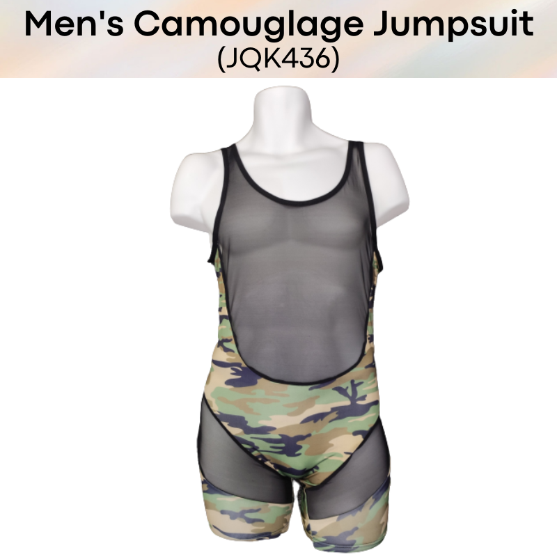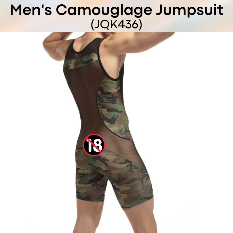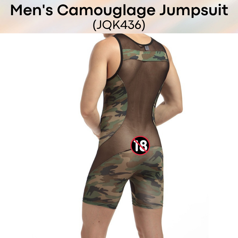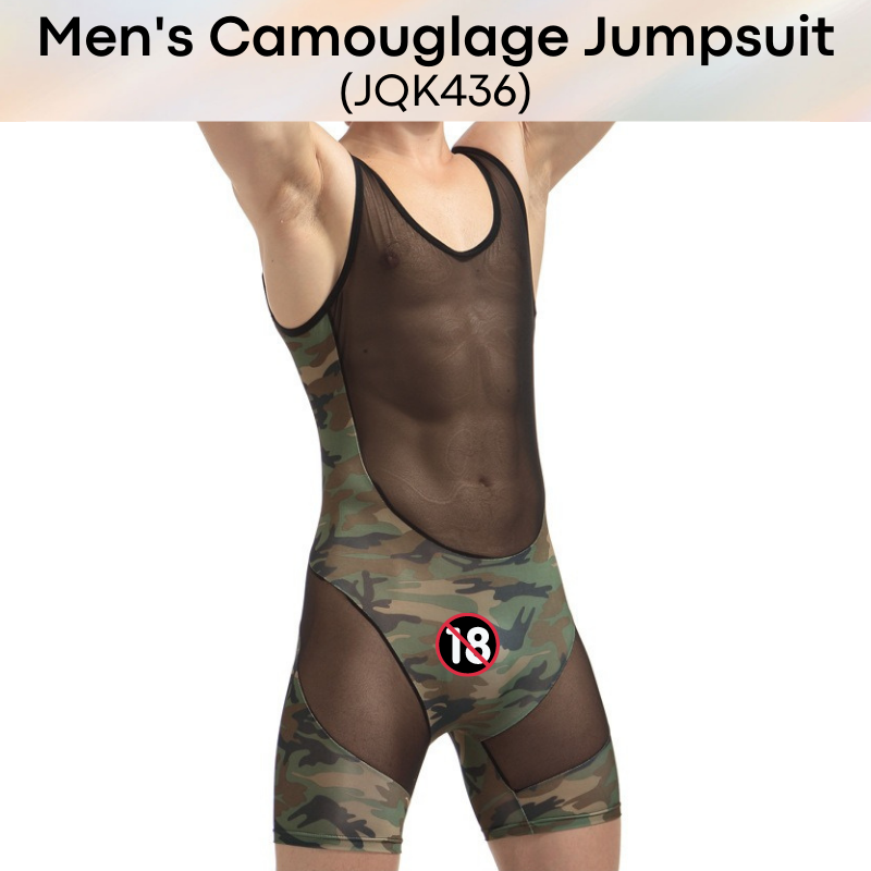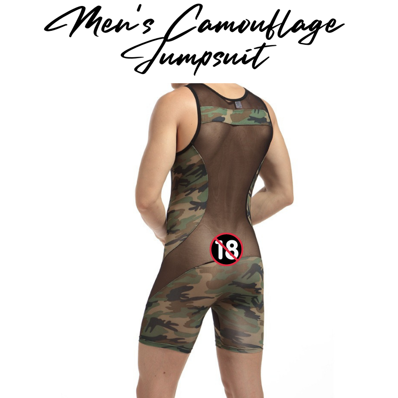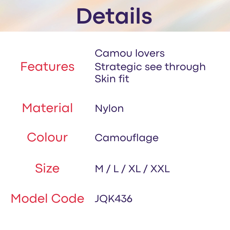 Made of nylon. Body hugging jump suit, teasing strategic parts with partial see through. Camou print for army lovers.