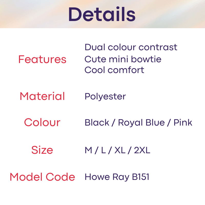 Made of polyester. Cute mini bowtie accessory. Dual color contrast to show off your jewels. Low waist. Cool comfort.