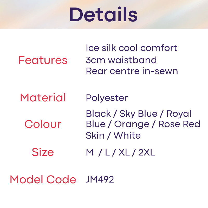 Made of polyester. Ice silk cool comfort. Centre rear insewn, which brings your bum to fullness. Ample front pouch. Low rise, and minimises ride-up.