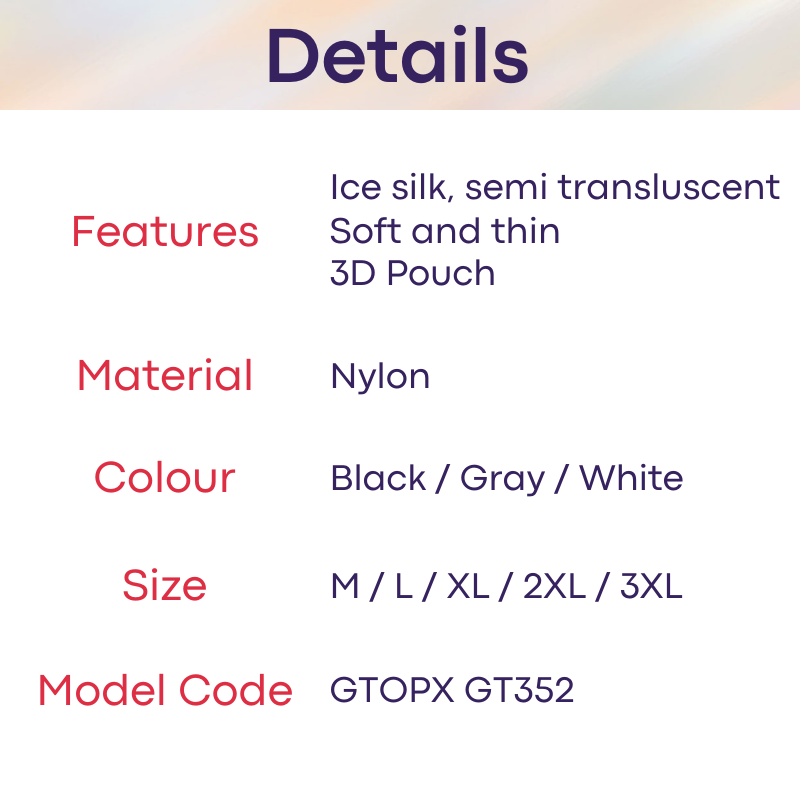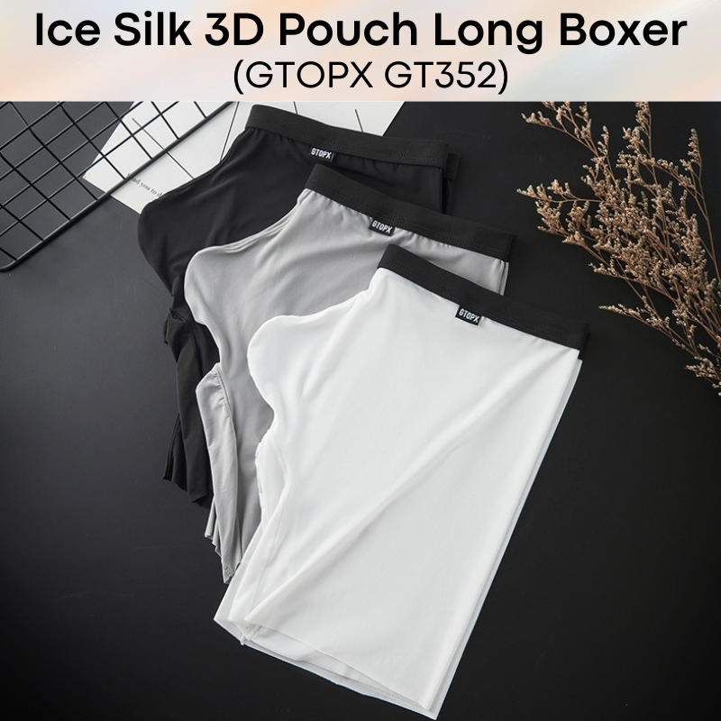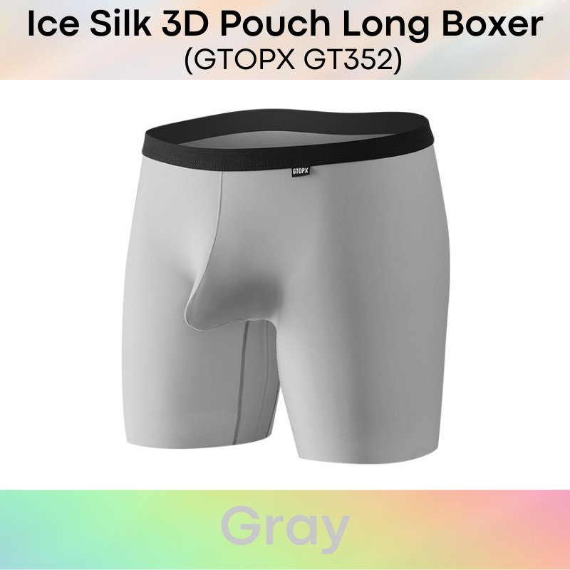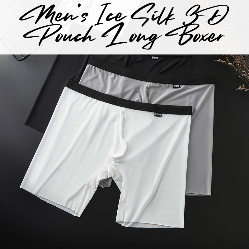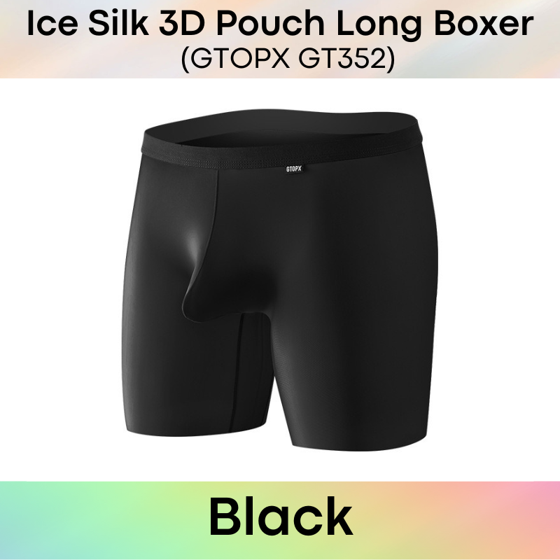 Made of nylon. Ice silk, semi translucent. Soft and thin. 3D pouch. Tights-like long boxer.