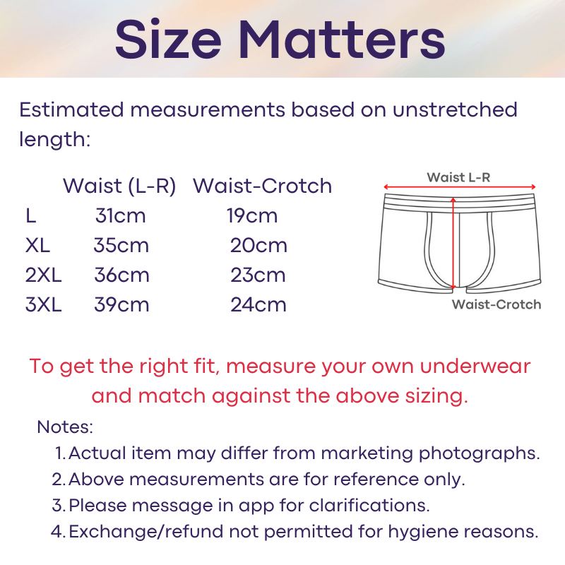 Please refer to seller' estimated measurements before placing order. There is no exchange/refund if sizing is wrong. To get the right measurement, measure with your underwear flat, from left to right of waistband. Thereafter, check against the size chart in this listing for the closer match. This is a general guideline, and does not factor in certain body shapes (thigh, bum etc) and elasticity of the waistband. Every brand/model varies in sizing measurements.