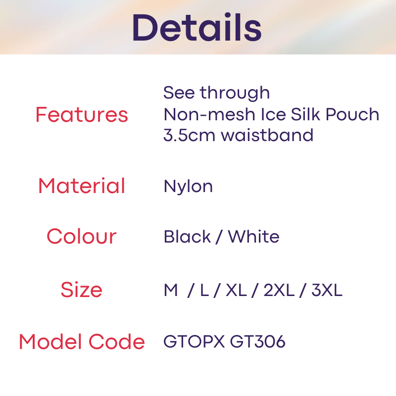 Made of nylon. Mesh see through and breathability. Non-Mesh ice silk front pouch to contain accidental stains/spills.