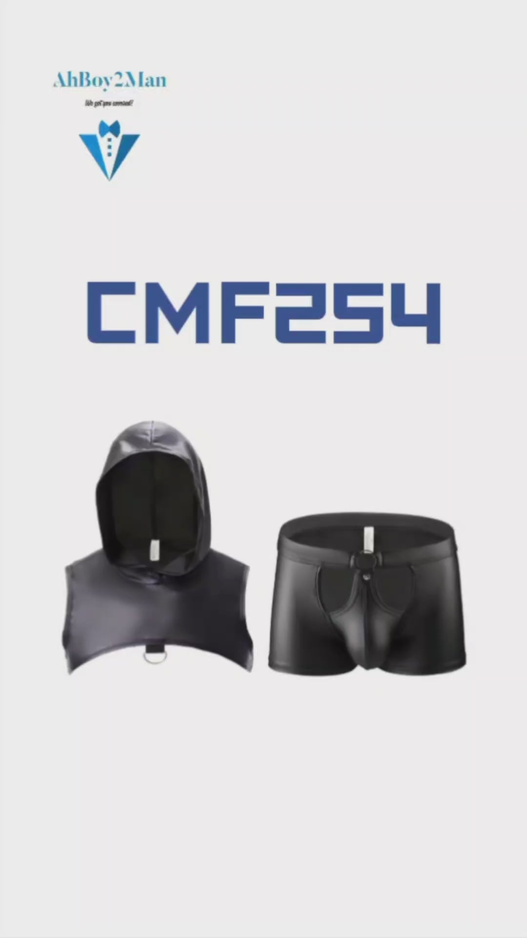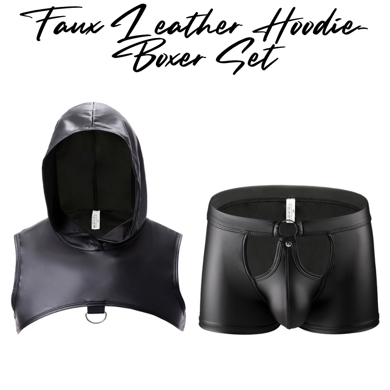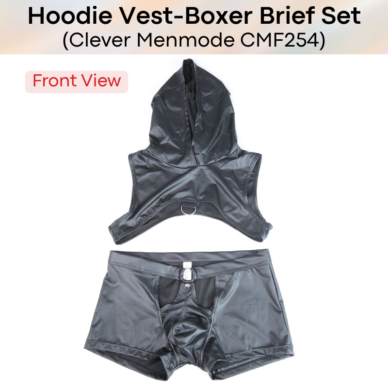 Made of polyester. Hoodie cropped vest top, comes with a metal ring for leash hookup. Boxer brief trunks have gap opening at pouch sides to show skin. Boxer trunks comes with a metal ring for leash hookup. Price includes Hoodie Vest and Boxer.