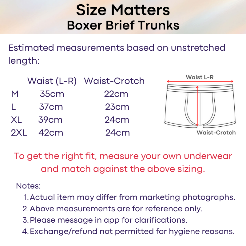 Please refer to seller' estimated measurements before placing order. There is no exchange/refund if sizing is wrong. To get the right measurement, measure with your underwear flat, from left to right of waistband. Thereafter, check against the size chart in this listing for the closer match. This is a general guideline, and does not factor in certain body shapes (thigh, bum etc) and elasticity of the waistband. Every brand/model varies in sizing measurements.
