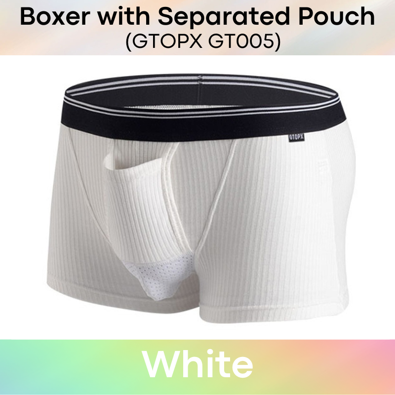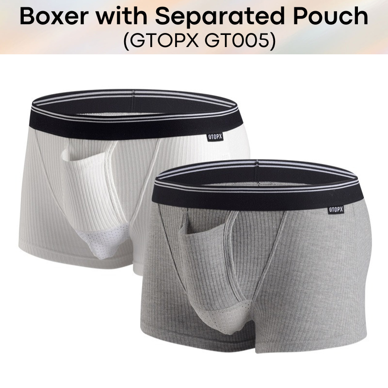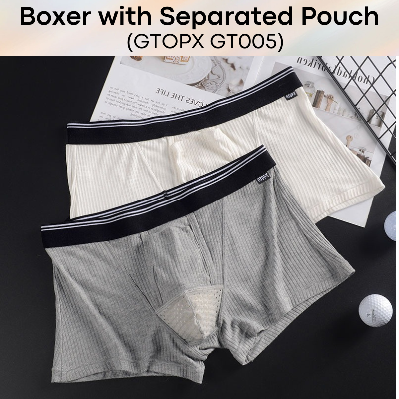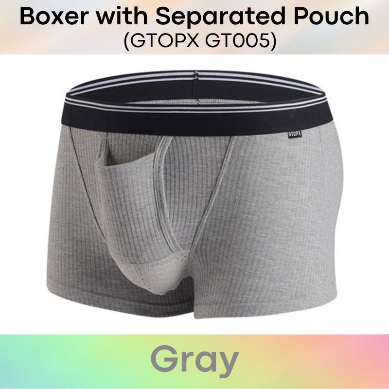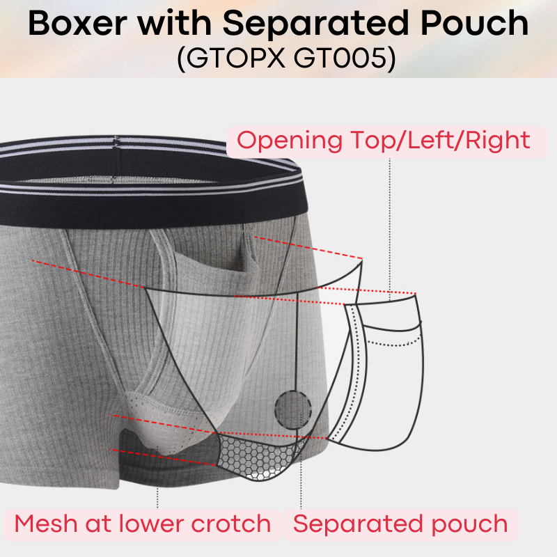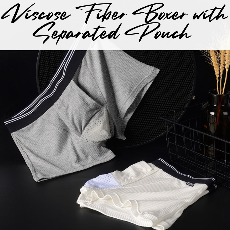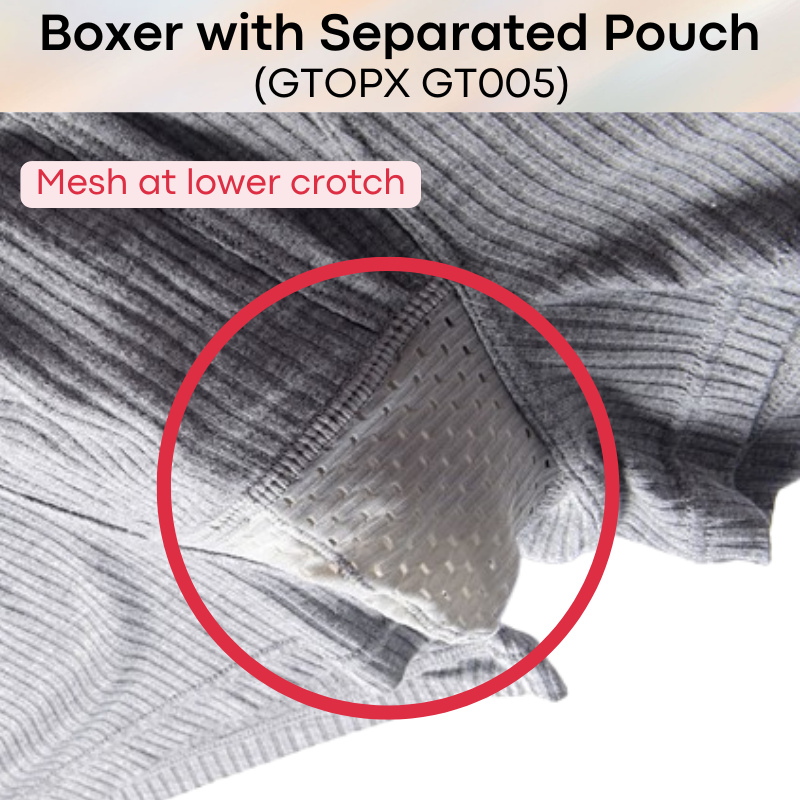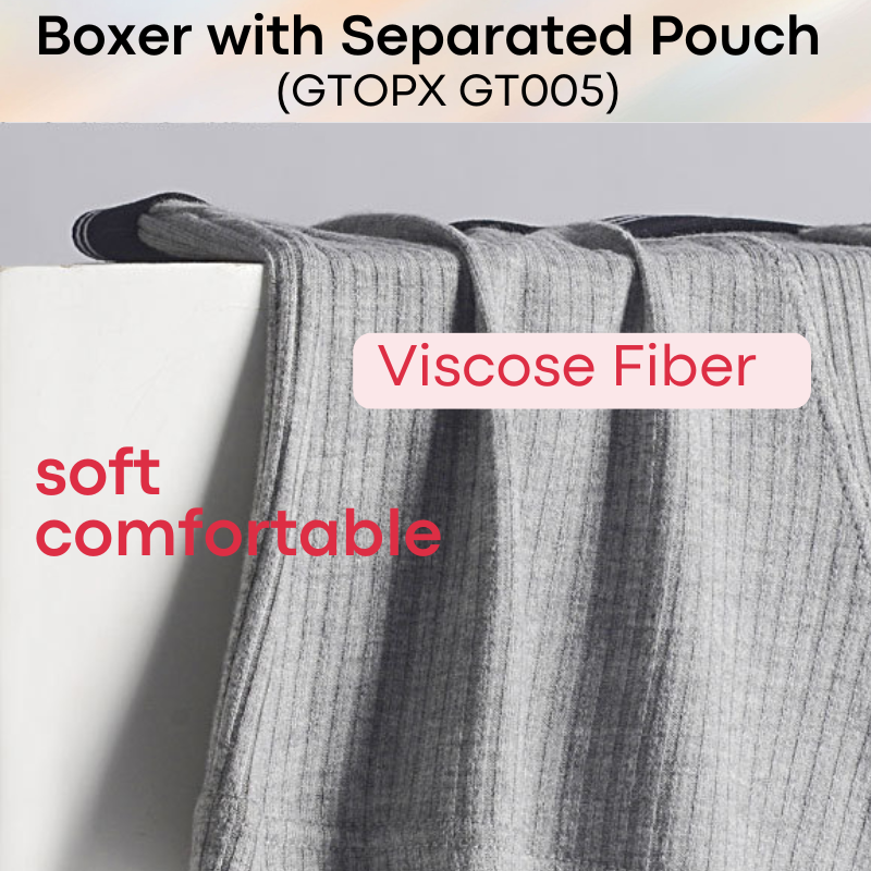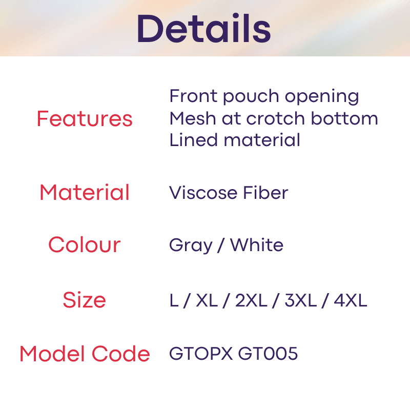 Made of viscose fiber. Soft and comfortable. Separated pouch with opening (left/right slit, top). Bottom crotch has a mesh patch for breathability. Lined material.