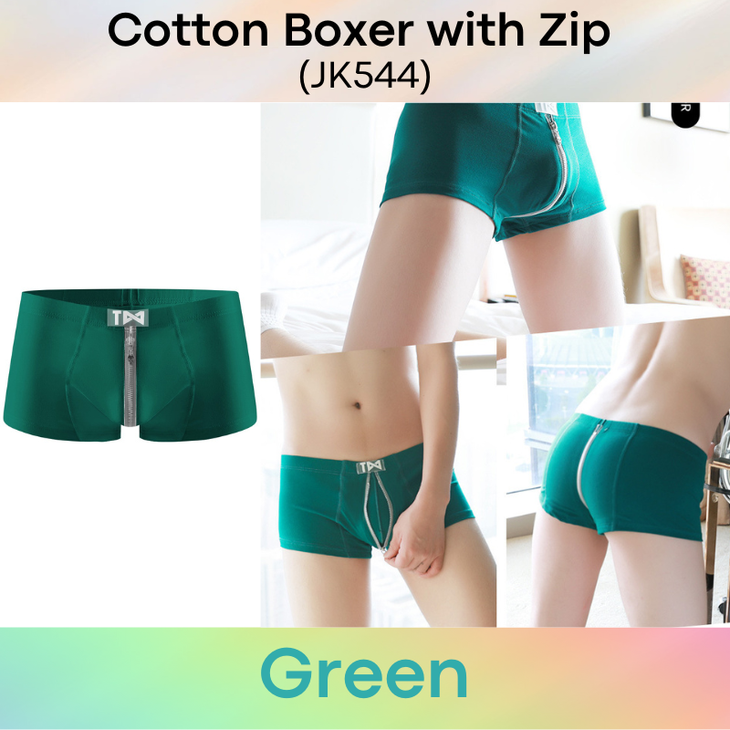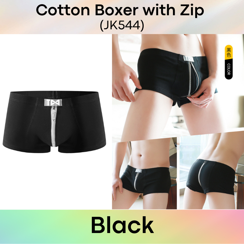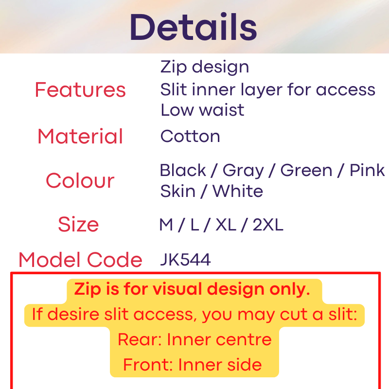 Made of cotton. Zipper design (zipper opens to inner layer and not to body skin). If wish to have access with zipper opening, you may slit inner rear centre later and inner front side.