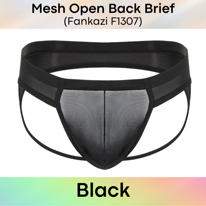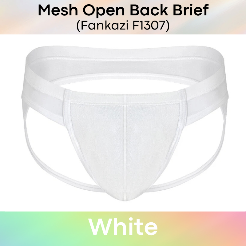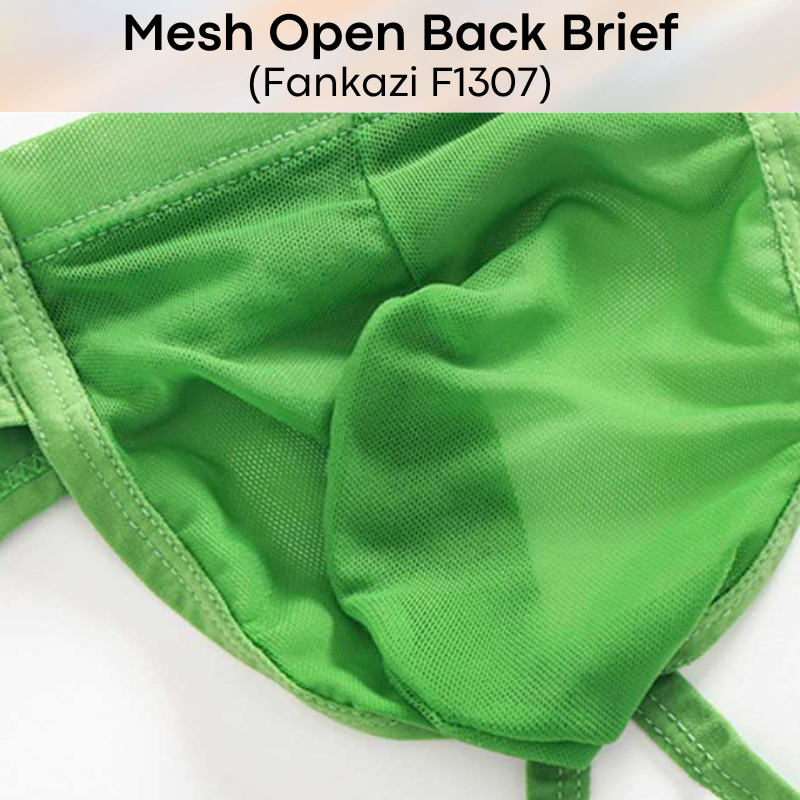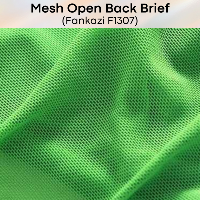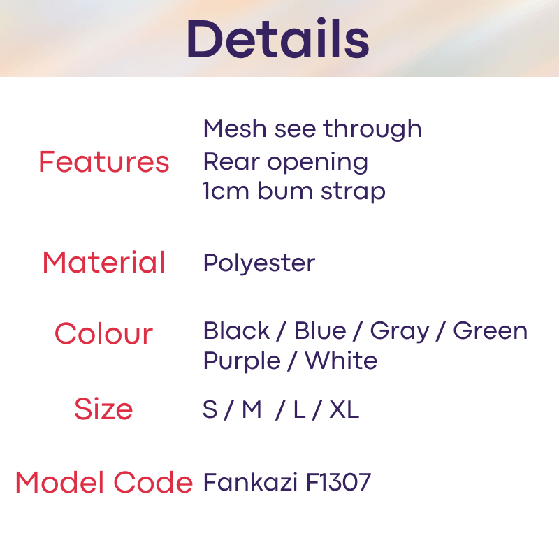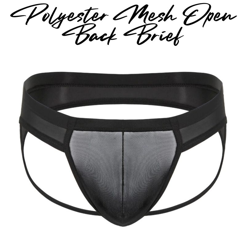 Made of polyester. Mesh see through. Brief with rear opening to show off your posterior. Even if exposed, opaque rear top and sides merely show off a regular brief, hiding the mesh material beneath. 1cm bum strap for bare and sexy feel.