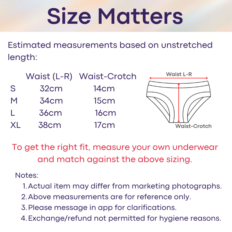 Please refer to seller' estimated measurements before placing order. There is no exchange/refund if sizing is wrong. To get the right measurement, measure with your underwear flat, from left to right of waistband. Thereafter, check against the size chart in this listing for the closer match. This is a general guideline, and does not factor in certain body shapes (thigh, bum etc) and elasticity of the waistband. Every brand/model varies in sizing measurements.