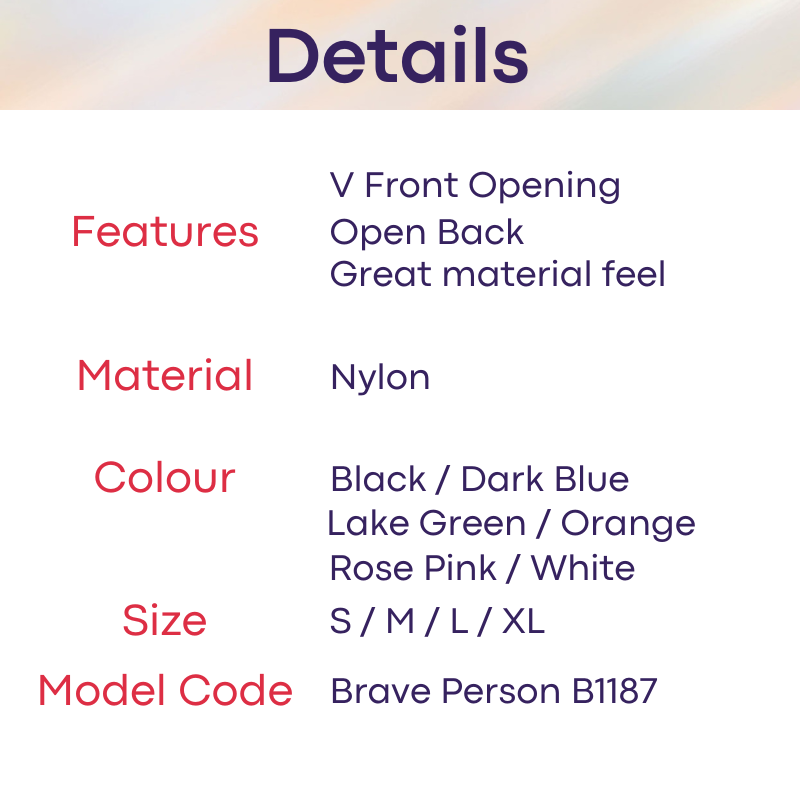 Made of nylon, unique brief with front V opening and open back. Material is super smooth and soft to the touch.