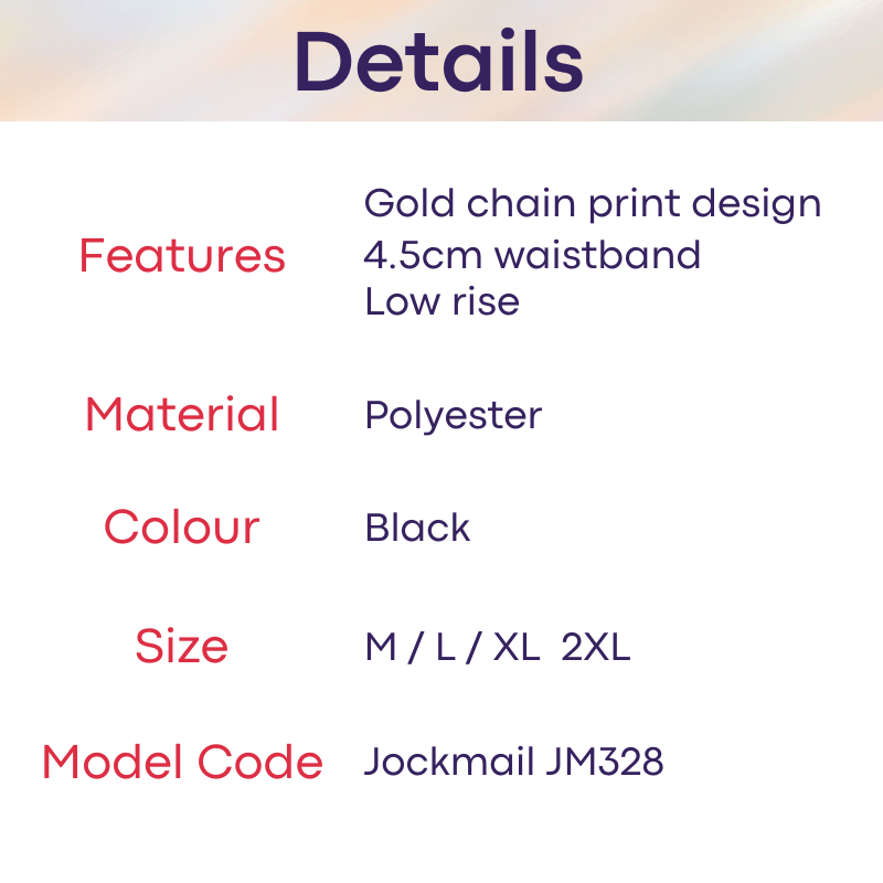 Made of polyester. modal fabric. Gold print design. 4.5cm wide waistband.