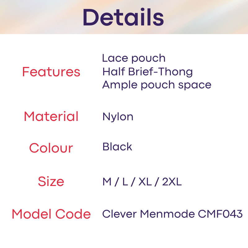 Made of nylon. Lace pouch, ample space. High back, brief-thong. Great for lace lovers.