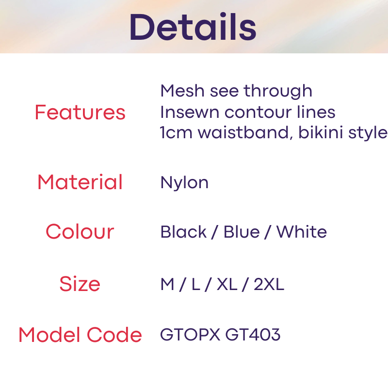 Made of nylon. Ice silk comfort. Mesh see through. Contour insewn lines to highlight your assets. 1cm waistband.