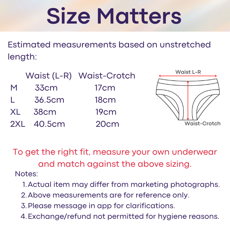 Please refer to seller' estimated measurements before placing order. There is no exchange/refund if sizing is wrong. To get the right measurement, measure with your underwear flat, from left to right of waistband. Thereafter, check against the size chart in this listing for the closer match. This is a general guideline, and does not factor in certain body shapes (thigh, bum etc) and elasticity of the waistband. Every brand/model varies in sizing measurements.