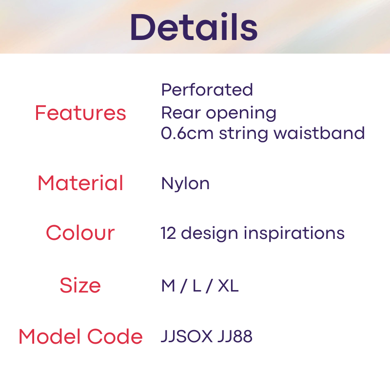 Made of nylon. 12 design inspirations. 0.6cm string waistband. Rear opening for easy access.