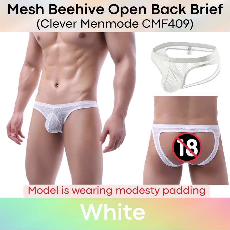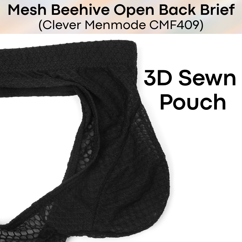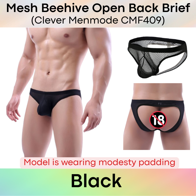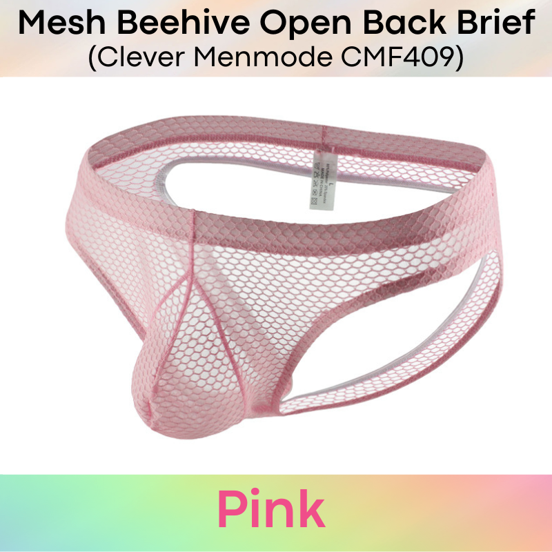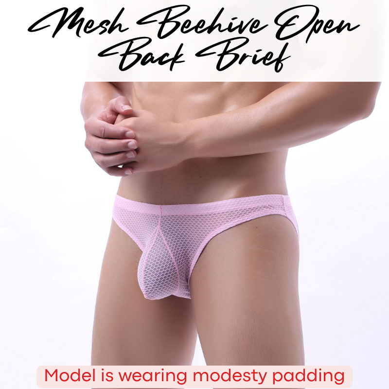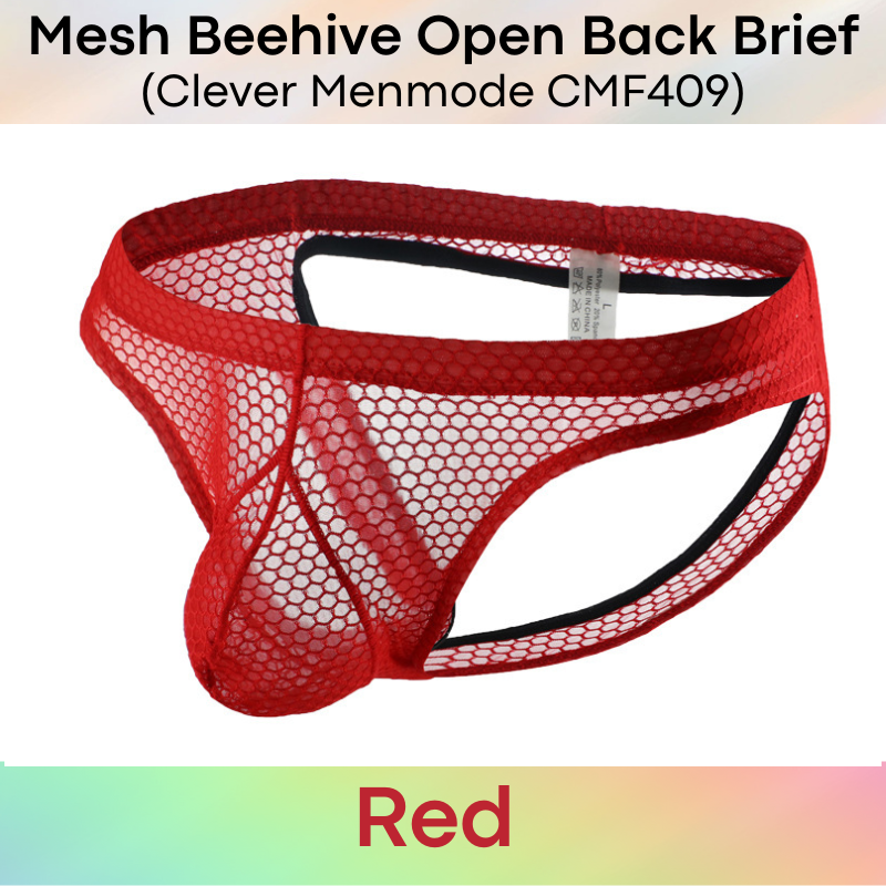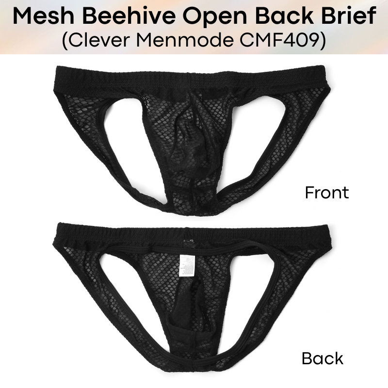 Made of polyester. Mesh with beehive design. Open back with different colour outline. Cross between brief and jockstrap.