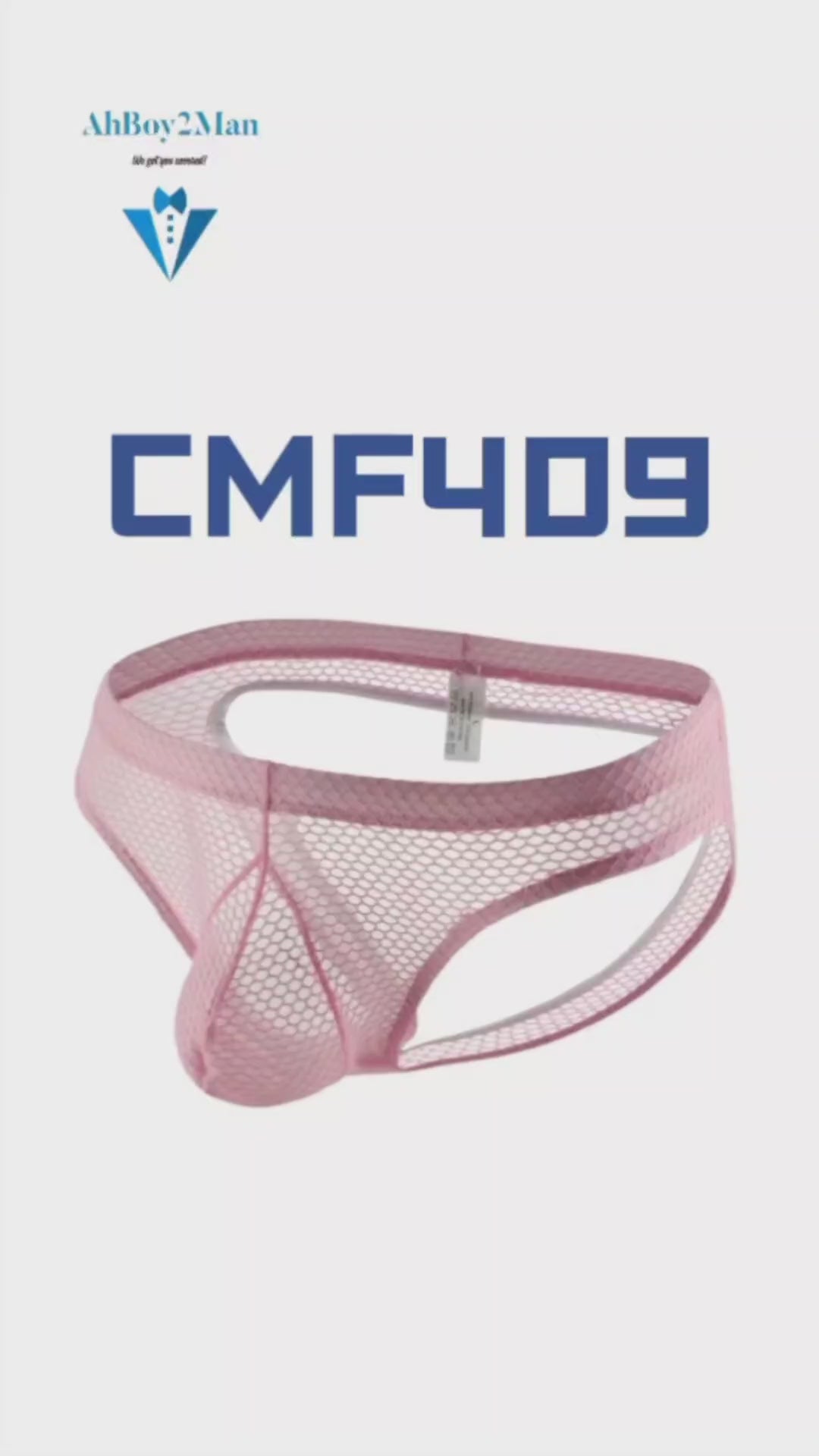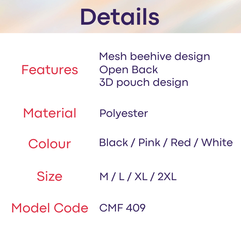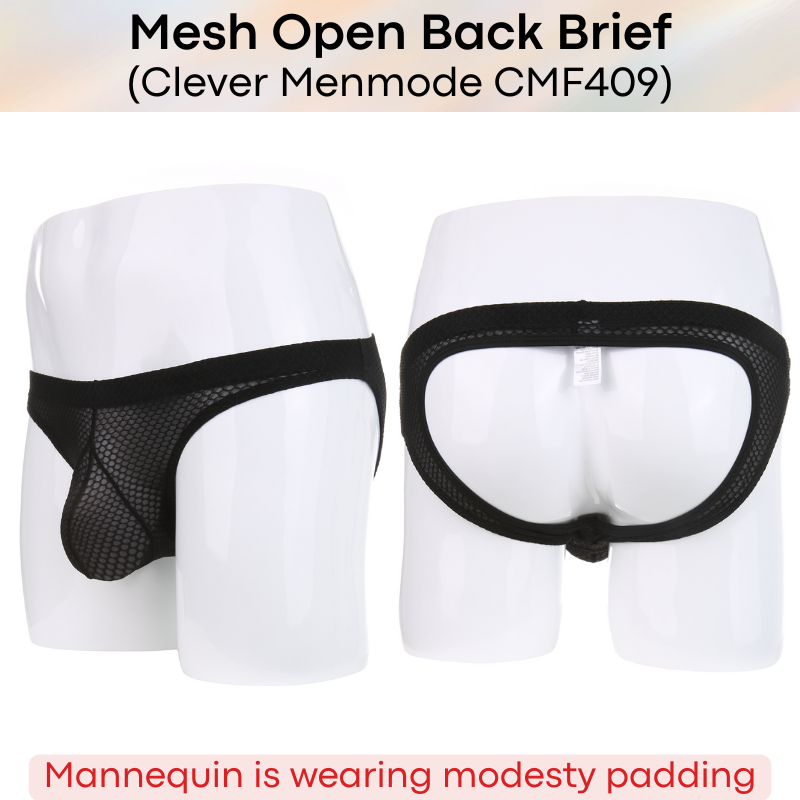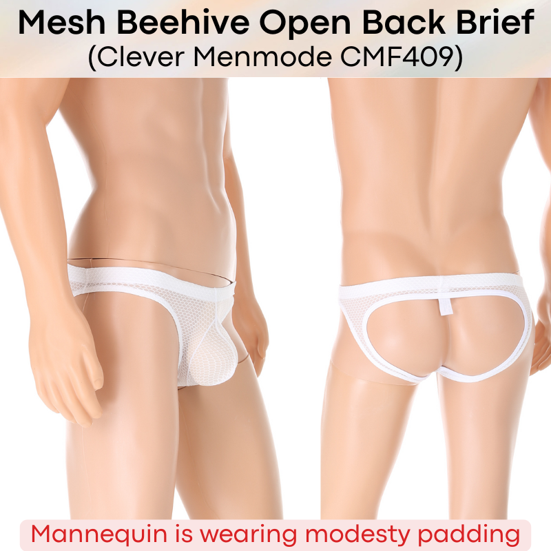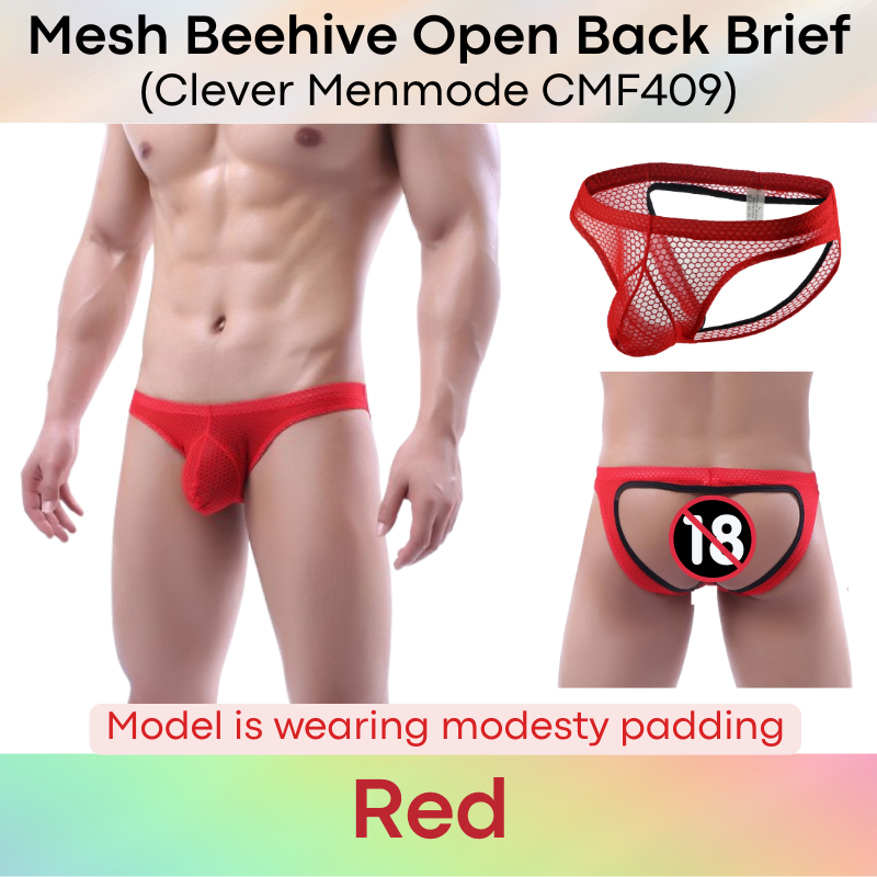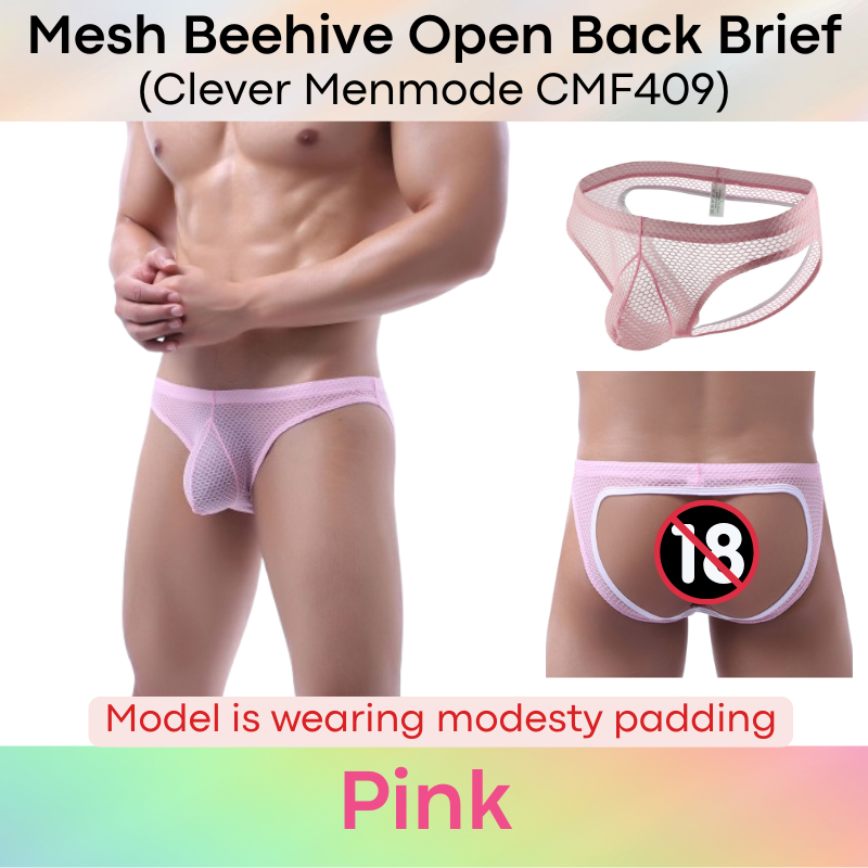 Made of polyester. Mesh with beehive design. Open back with different colour outline. Cross between brief and jockstrap.