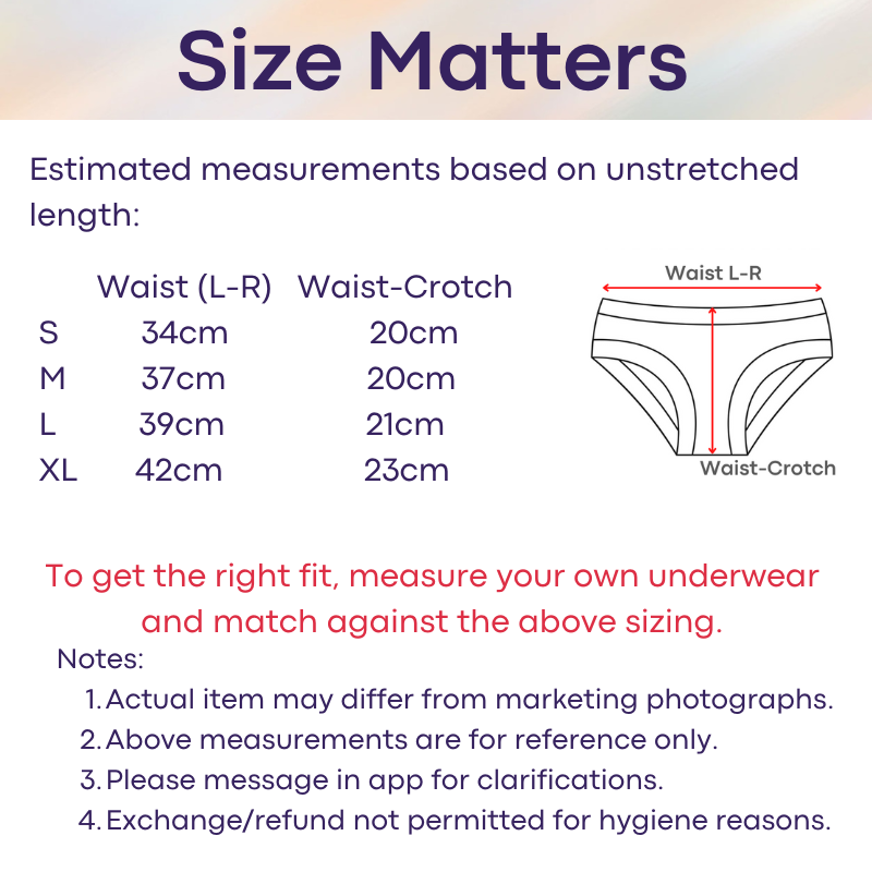 Please refer to seller' estimated measurements before placing order. There is no exchange/refund if sizing is wrong. To get the right measurement, measure with your underwear flat, from left to right of waistband. Thereafter, check against the size chart in this listing for the closer match. This is a general guideline, and does not factor in certain body shapes (thigh, bum etc) and elasticity of the waistband. Every brand/model varies in sizing measurements.