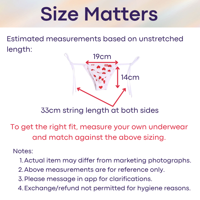 Please refer to seller' estimated measurements before placing order. There is no exchange/refund if sizing is wrong. To get the right measurement, measure with your underwear flat, from left to right of waistband. Thereafter, check against the size chart in this listing for the closer match. This is a general guideline, and does not factor in certain body shapes (thigh, bum etc) and elasticity of the waistband. Every brand/model varies in sizing measurements.