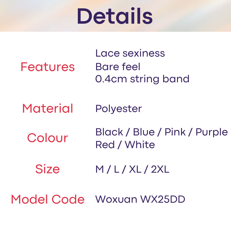 Made of polyester. Lace sexiness with a 0.4cm string band. As barest as can be.