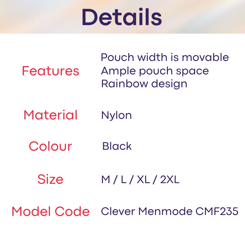 Made of nylon. Pouch movable along the rainbow band, can be expanded or pushed smaller. Ample pouch space.