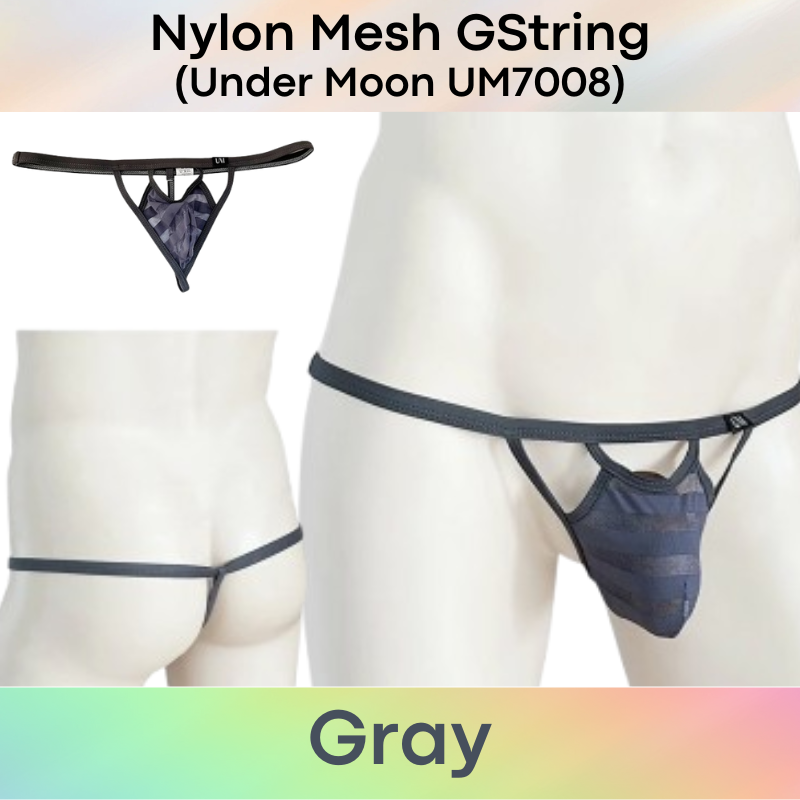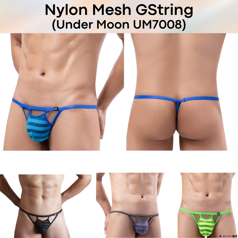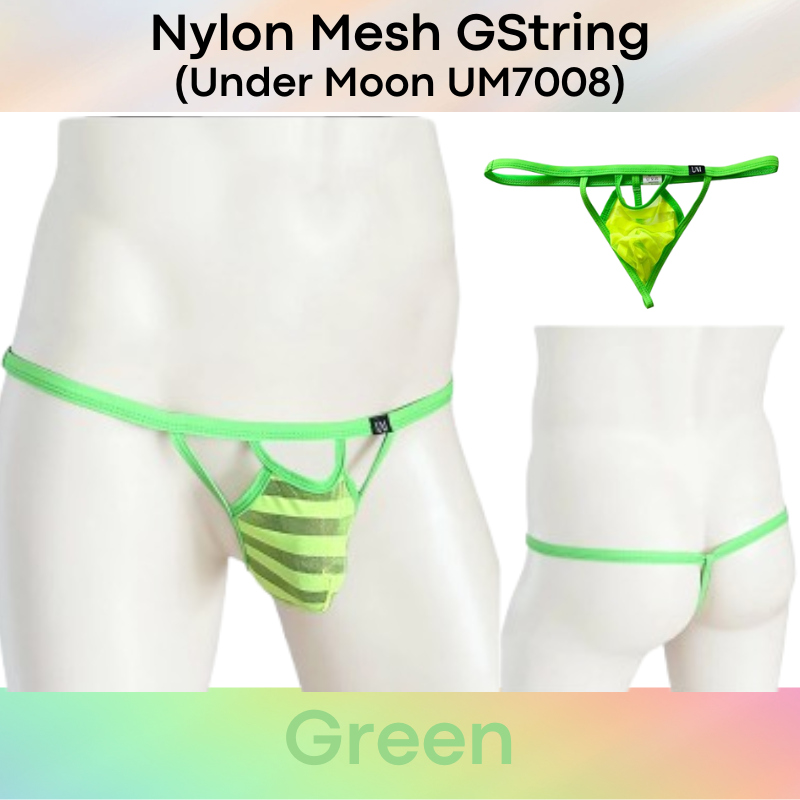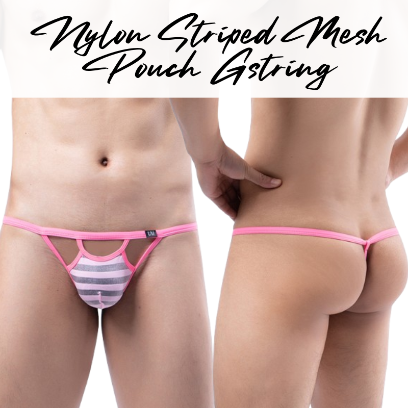 Made of nylon. Striped mesh pouch. 1.3cm waistband, with 0.8cm rear string.