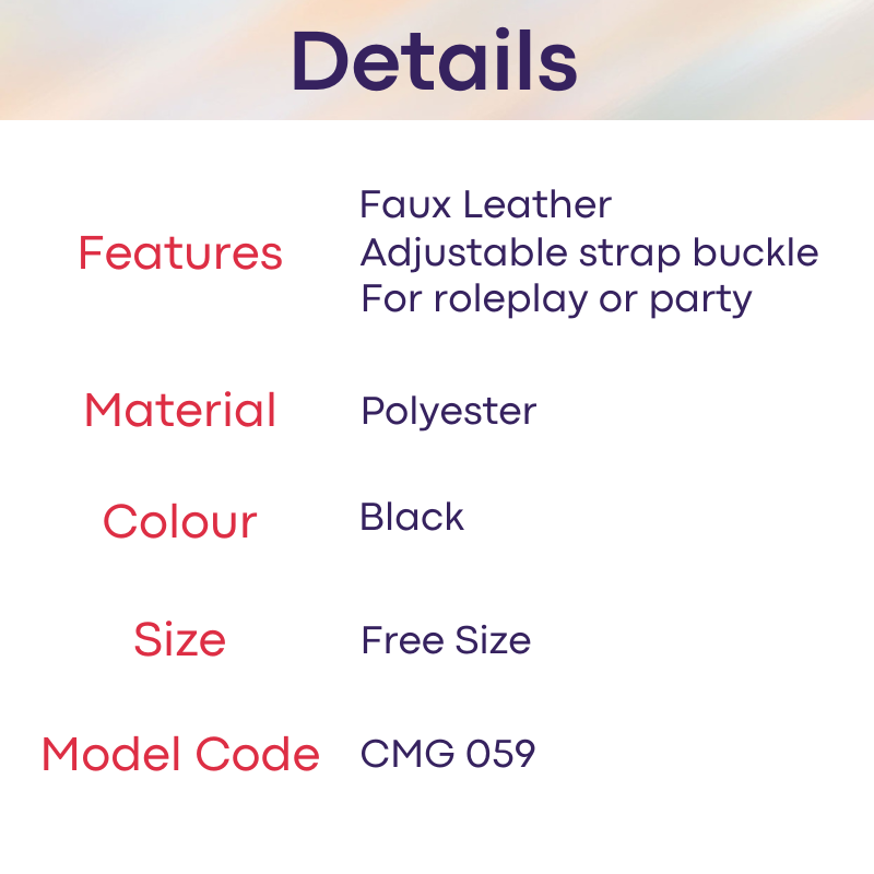 Made of polyester. 2.2cm width strap. Adjustable buckle to fit all body sizes. Great for role play or party. Wear with/without shirt.