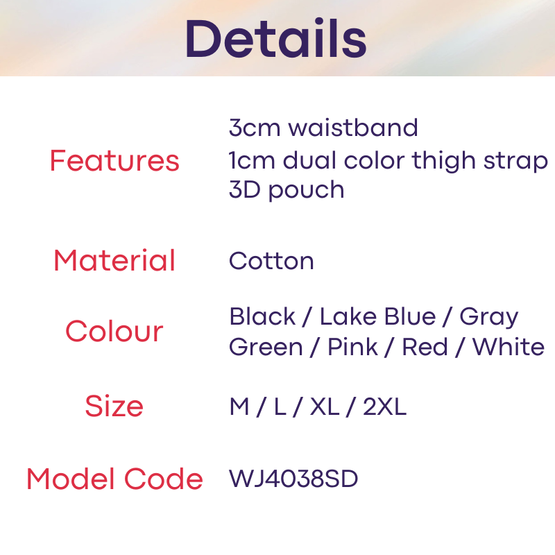 Made of cotton. 3cm waistband, 1cm thigh band. 2 different color thigh straps for chic and fun. Cotton comfort, with 3D pouch to show off your package.