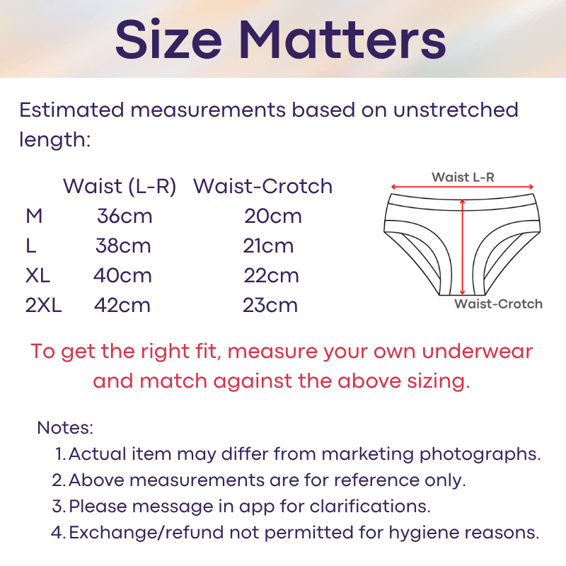 Please refer to seller' estimated measurements before placing order. There is no exchange/refund if sizing is wrong. To get the right measurement, measure with your underwear flat, from left to right of waistband. Thereafter, check against the size chart in this listing for the closer match. This is a general guideline, and does not factor in certain body shapes (thigh, bum etc) and elasticity of the waistband. Every brand/model varies in sizing measurements.