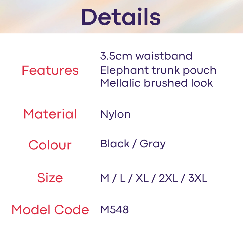 Made of nylon. 3.5cm waistband. Elephant trunk. Single waistband jockstrap.