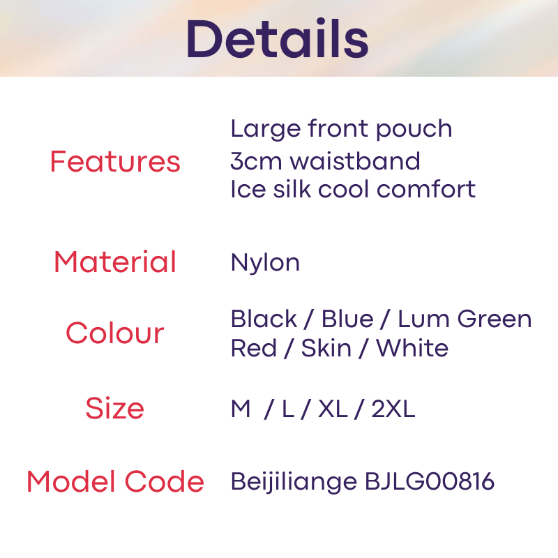 Made of nylon. Ice silk cool comfort. Big pouch for your package, great to park up or down. 3cm waistband for a solid feel around the waist.