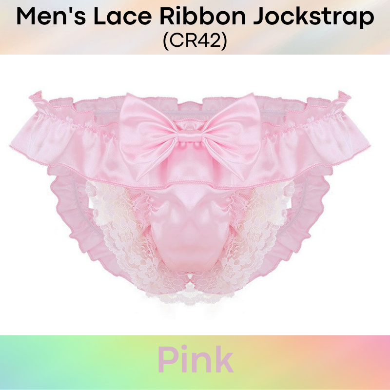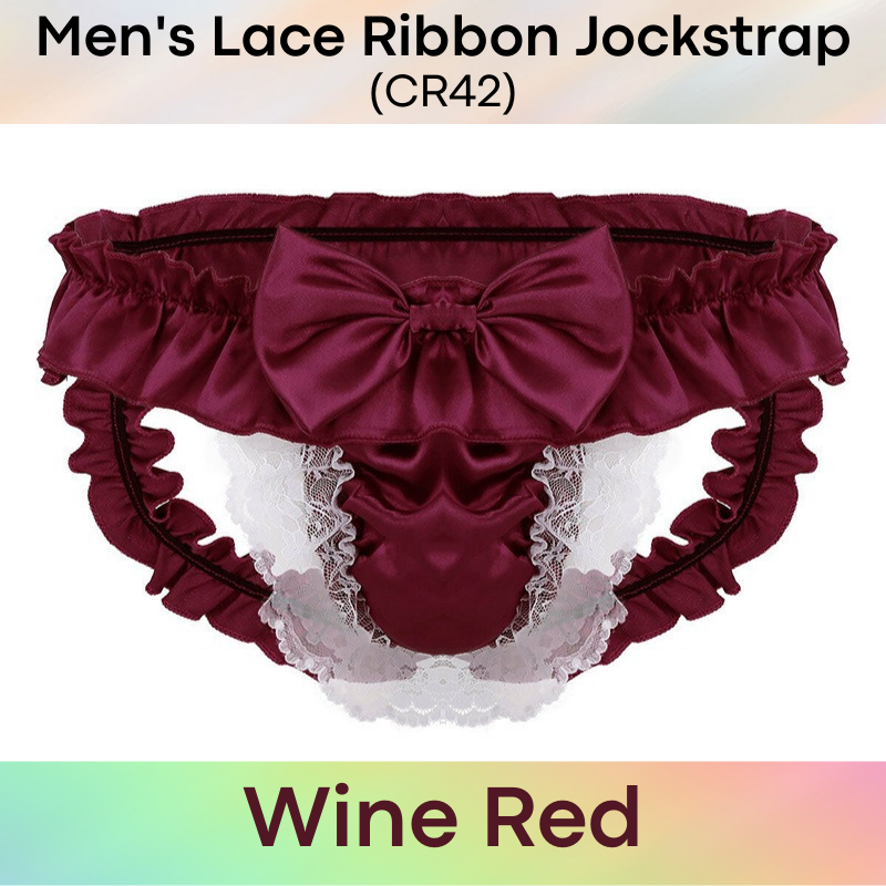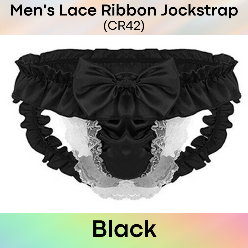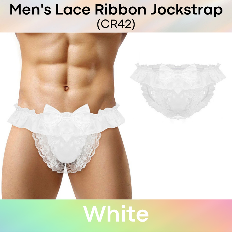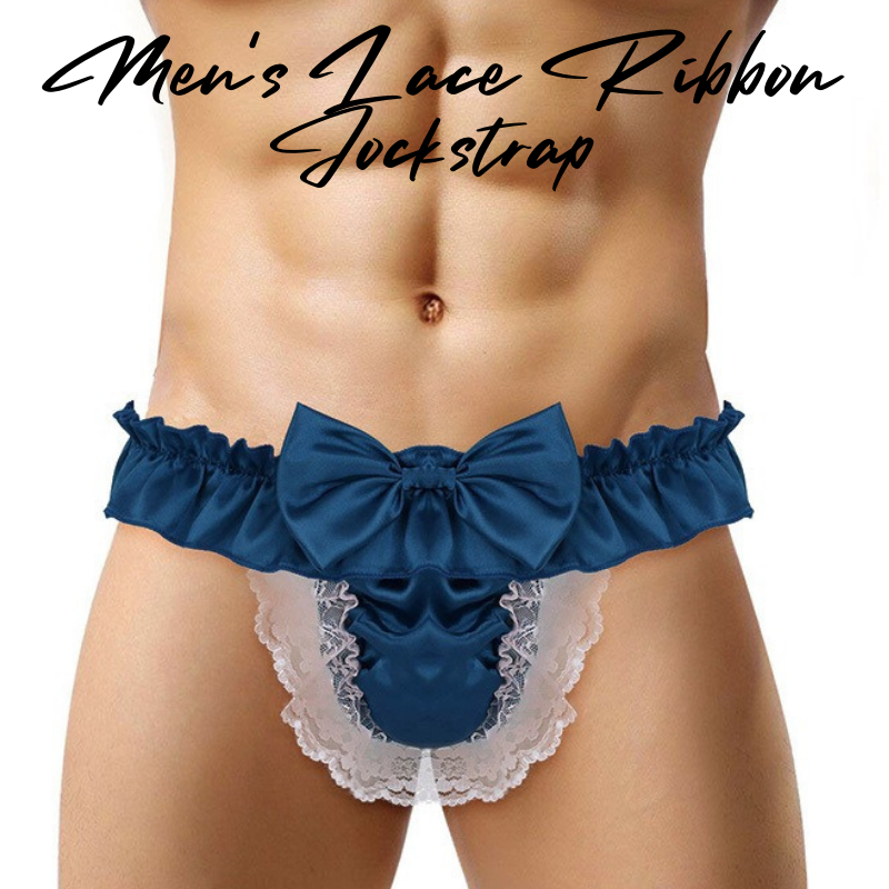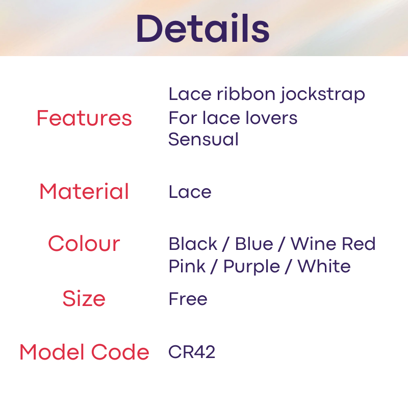 Made of lace. Lace with a ribbon right at front, and trimmings at the bands. Sensual and fun.