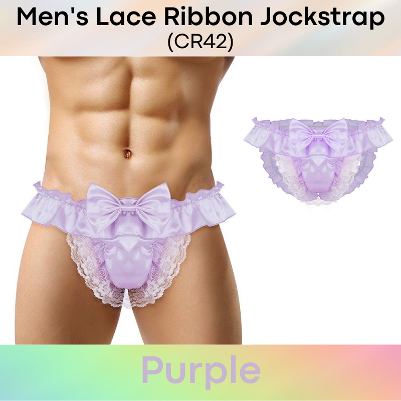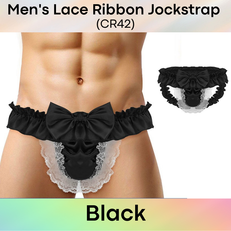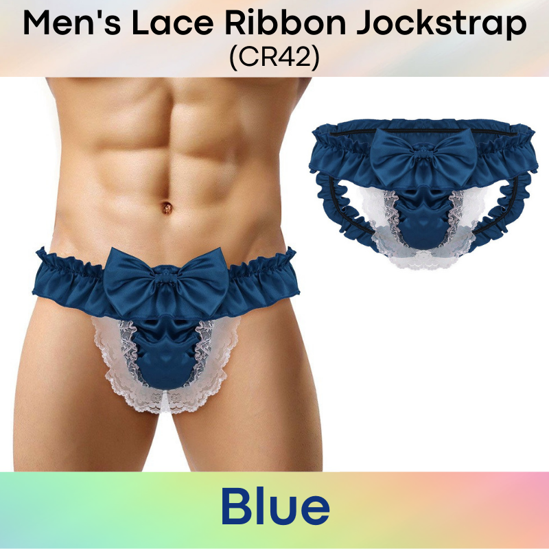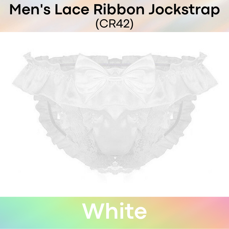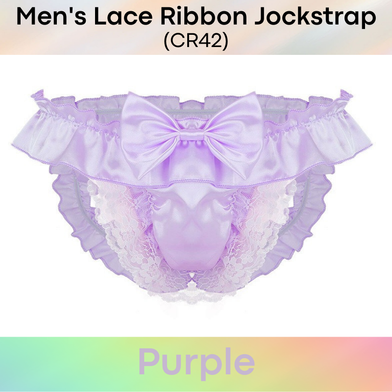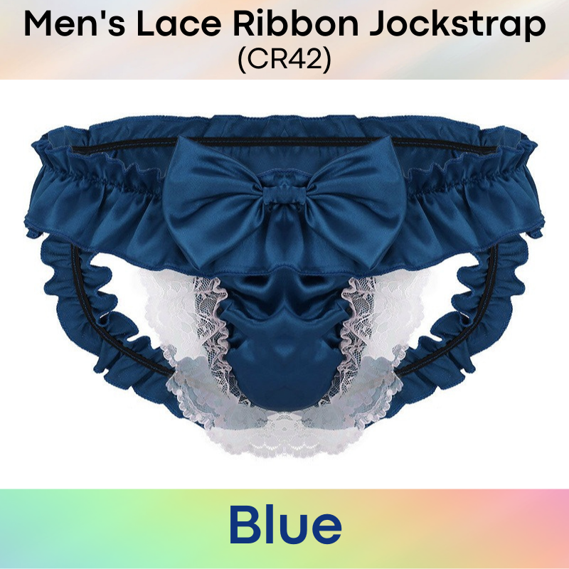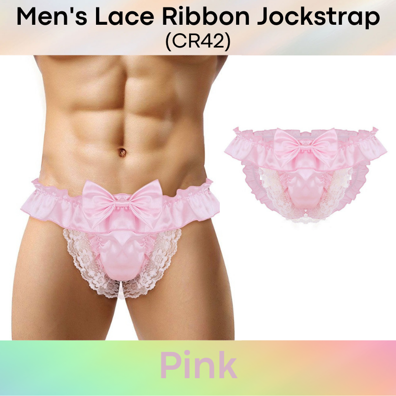 Made of lace. Lace with a ribbon right at front, and trimmings at the bands. Sensual and fun.