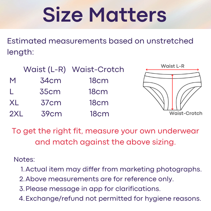 Please refer to seller' estimated measurements before placing order. There is no exchange/refund if sizing is wrong. To get the right measurement, measure with your underwear flat, from left to right of waistband. Thereafter, check against the size chart in this listing for the closer match. This is a general guideline, and does not factor in certain body shapes (thigh, bum etc) and elasticity of the waistband. Every brand/model varies in sizing measurements.