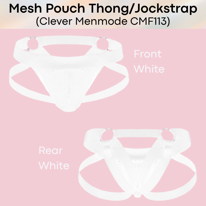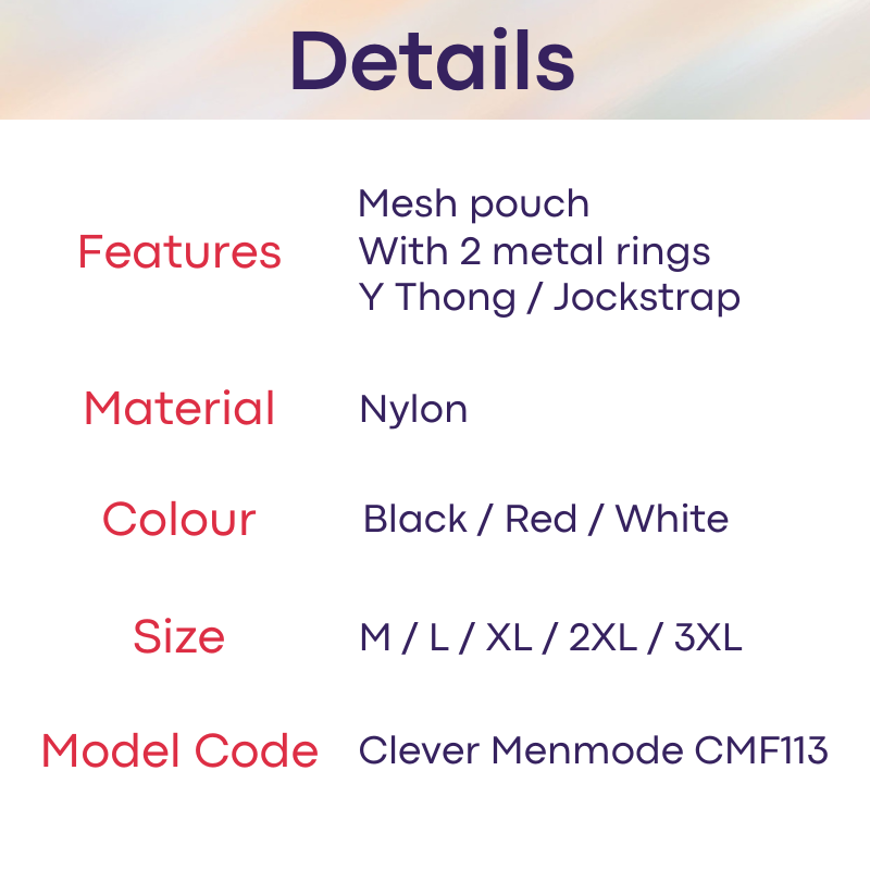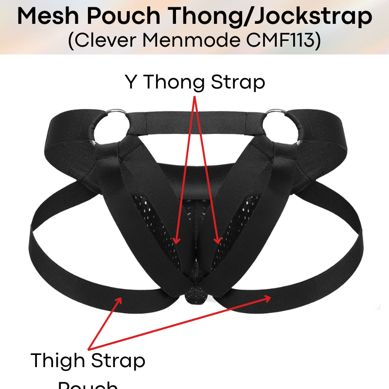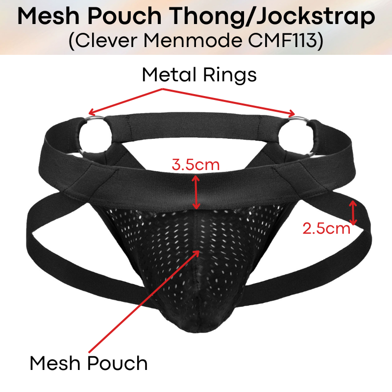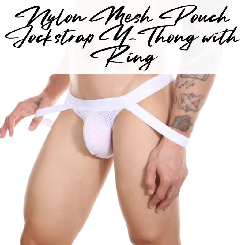 Made of nylon. Mesh pouch, great for down parkers. 3.5cm waistband with 2 rear metal rings. 2.5cm wide thigh and thong strap. Unique Y thong straps to add sexiness for play.