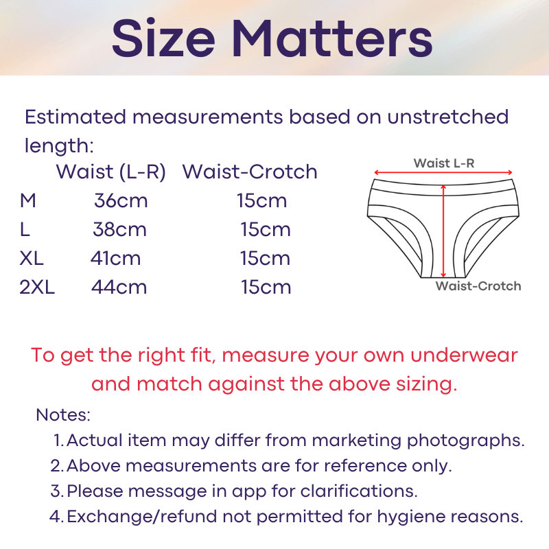 Please refer to seller' estimated measurements before placing order. There is no exchange/refund if sizing is wrong. To get the right measurement, measure with your underwear flat, from left to right of waistband. Thereafter, check against the size chart in this listing for the closer match. This is a general guideline, and does not factor in certain body shapes (thigh, bum etc) and elasticity of the waistband. Every brand/model varies in sizing measurements.