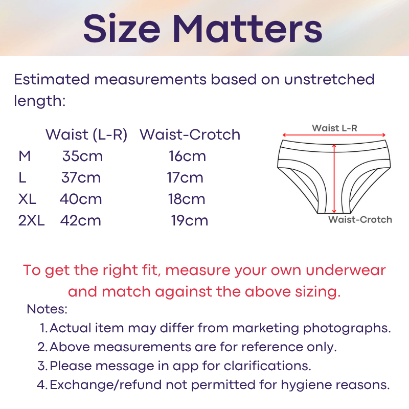 Please refer to seller' estimated measurements before placing order. There is no exchange/refund if sizing is wrong. To get the right measurement, measure with your underwear flat, from left to right of waistband. Thereafter, check against the size chart in this listing for the closer match. This is a general guideline, and does not factor in certain body shapes (thigh, bum etc) and elasticity of the waistband. Every brand/model varies in sizing measurements.